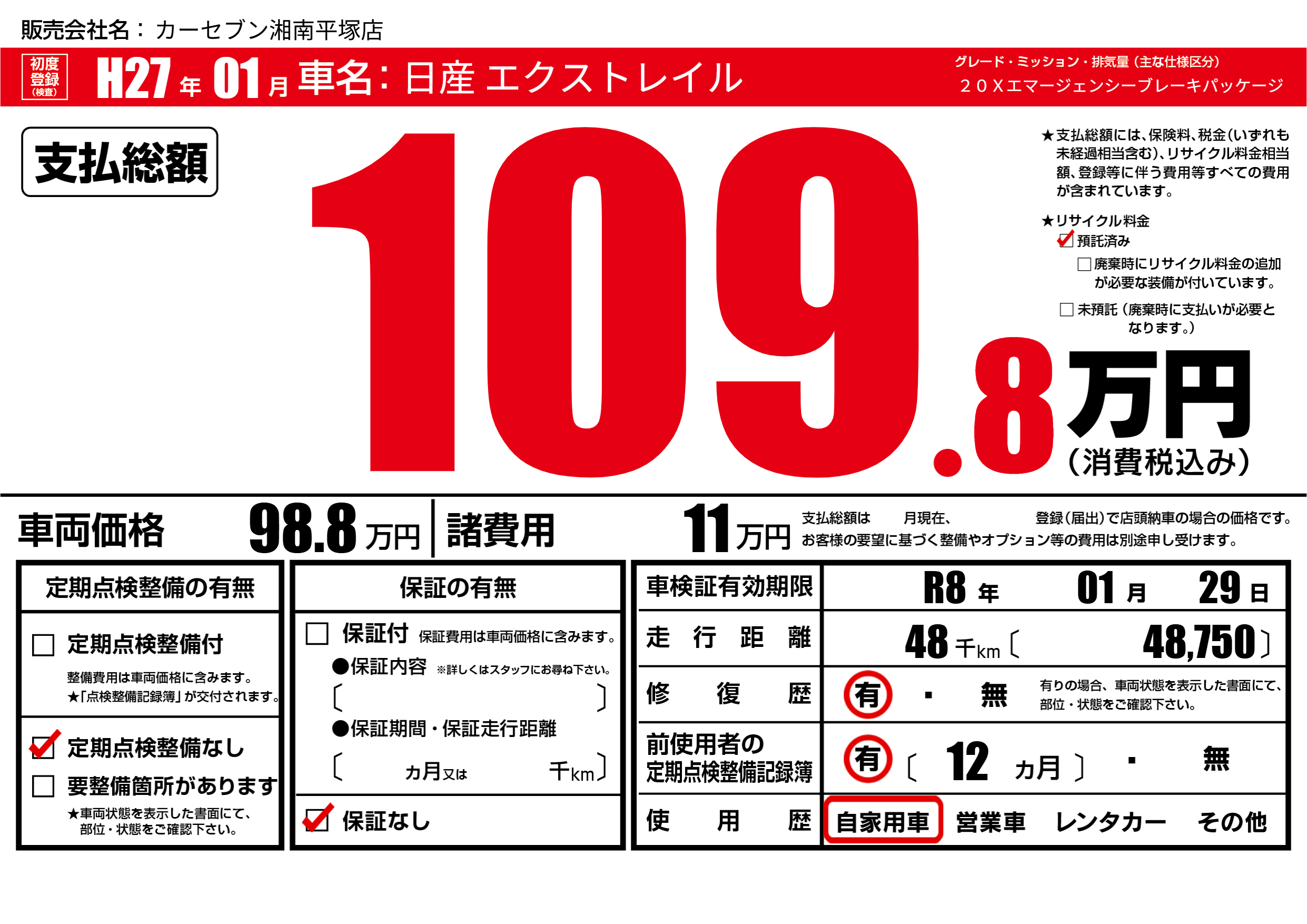 | 走行キロ | 4.8万km | 初年度登録 | H27年01月 |