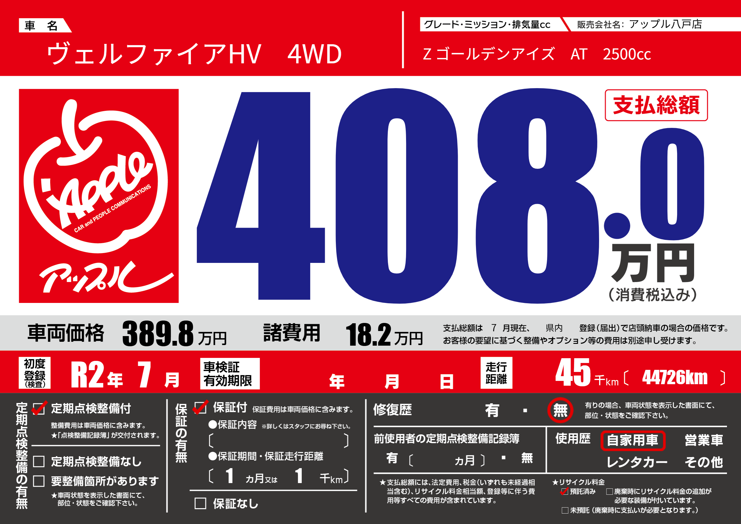| 走行キロ | 4.5万km | 初年度登録 | R2年7月 |