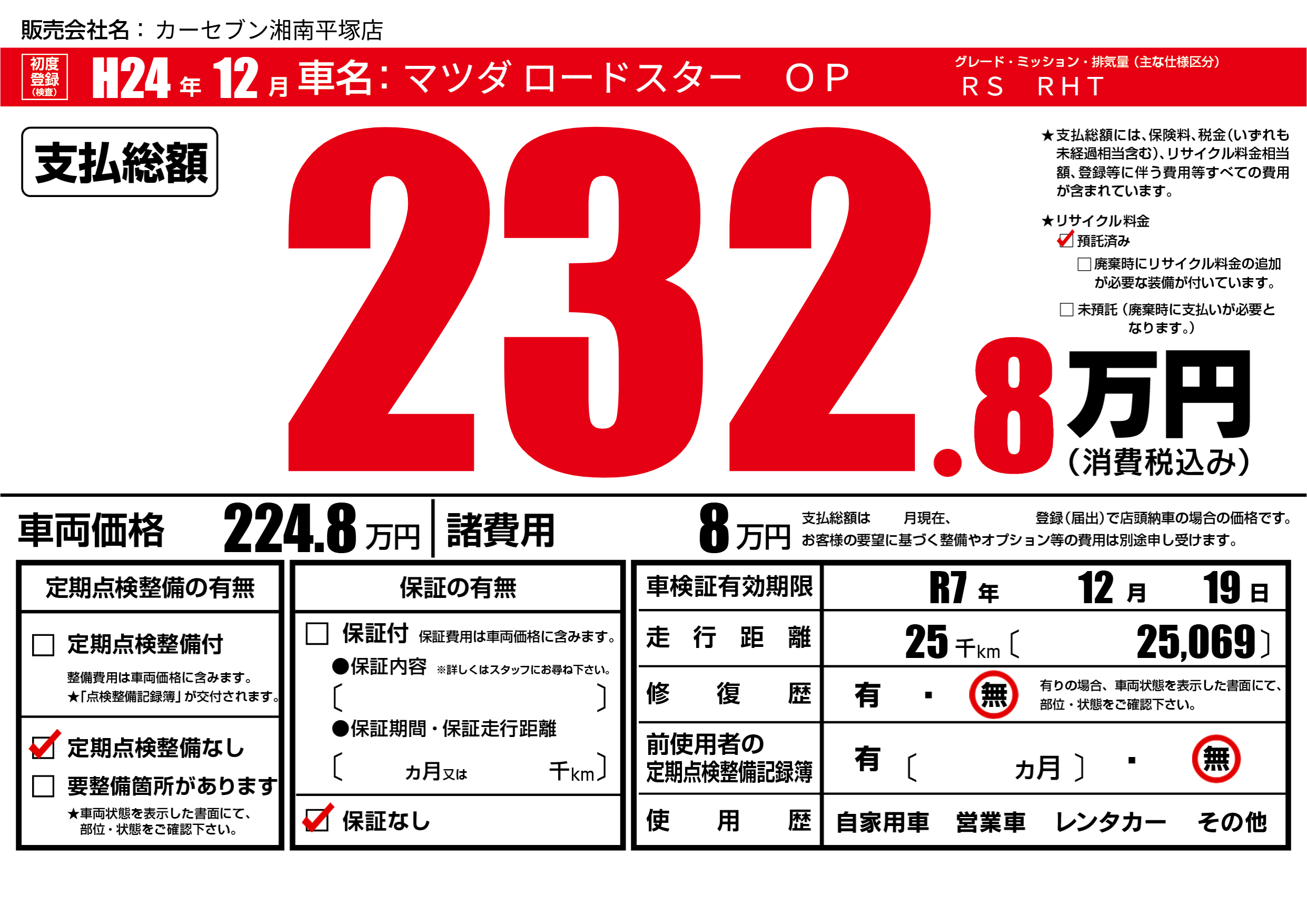 | 走行キロ | 2.5万km | 初年度登録 | H24年12月 |