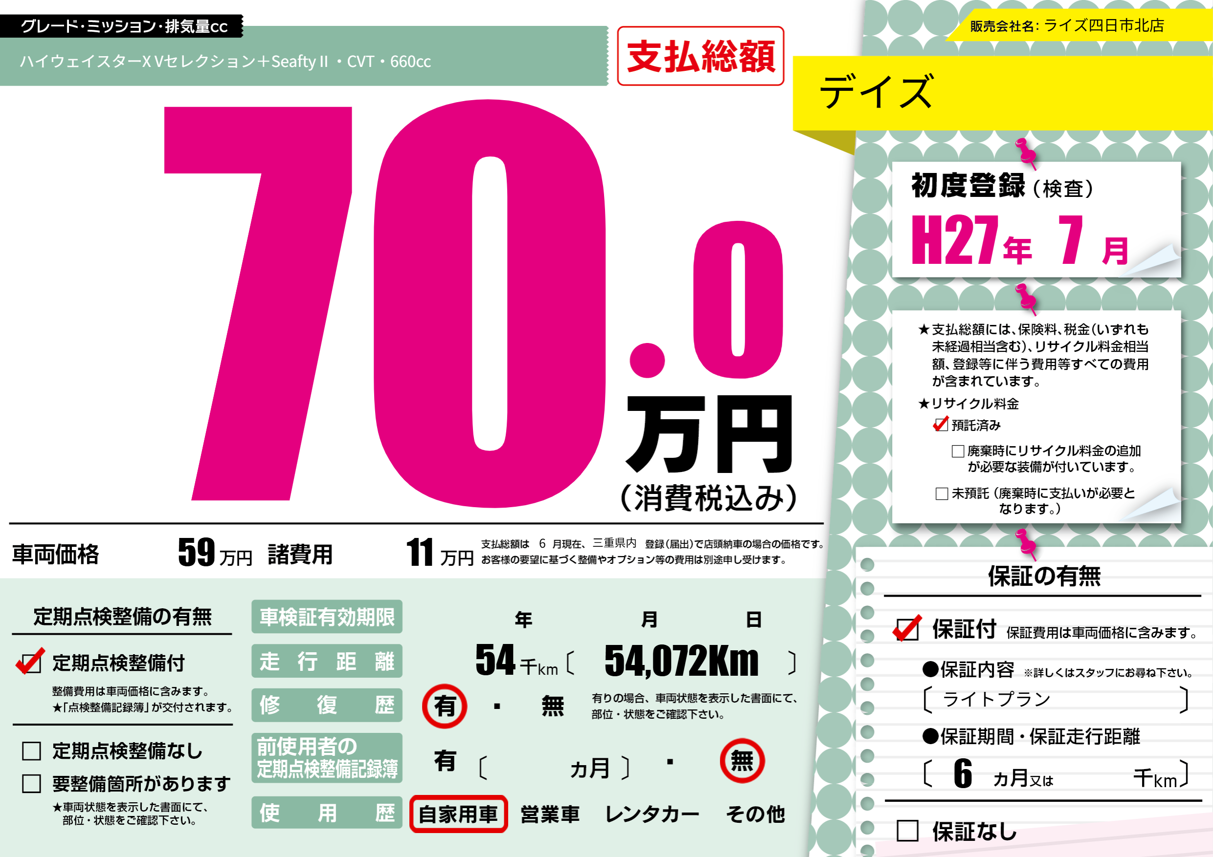 | 車名 | デイズ | グレード ミッション 排気量 |