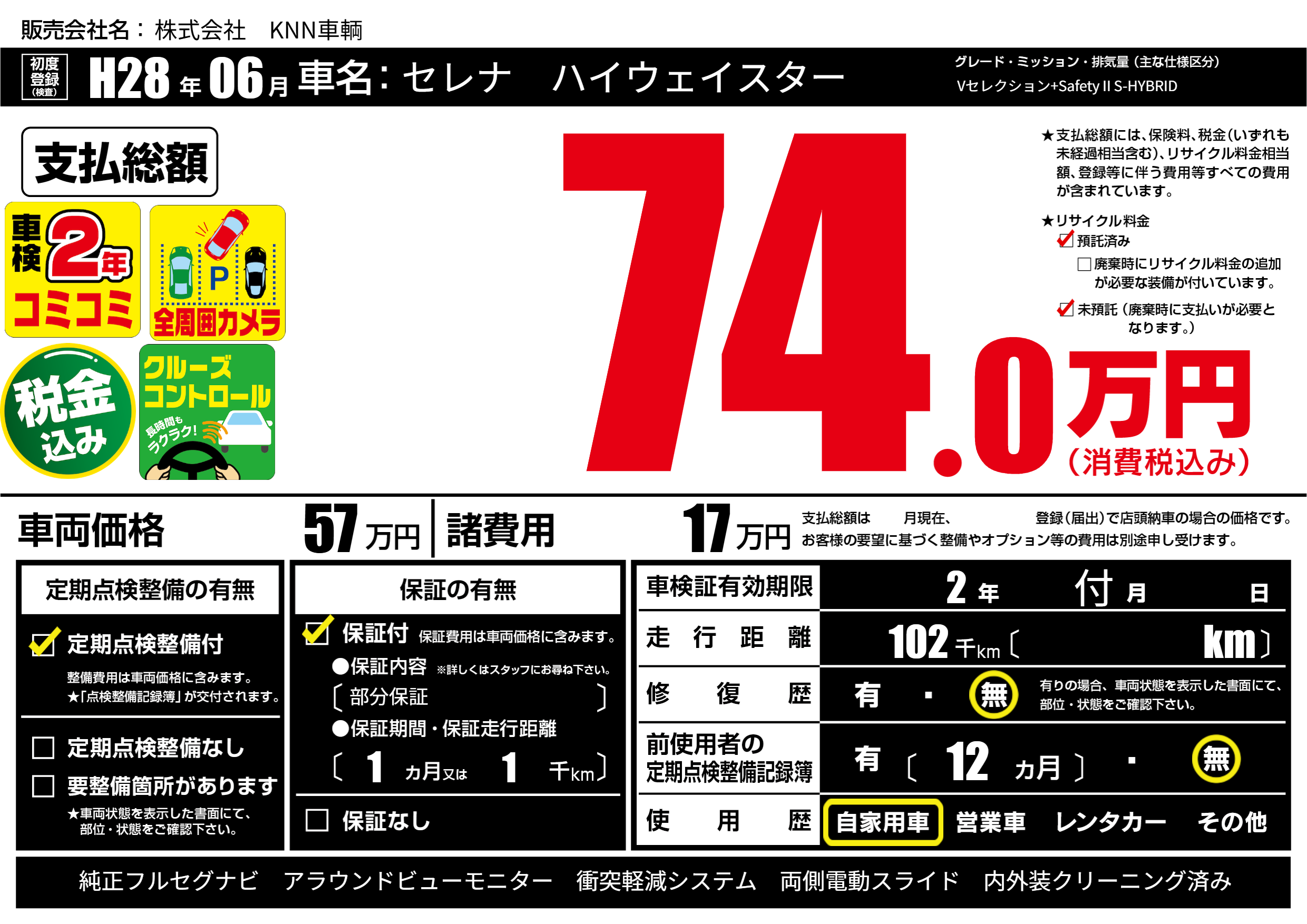 | 車名 | セレナ ハイウェイスター | グレード ミッション 排気量 |
