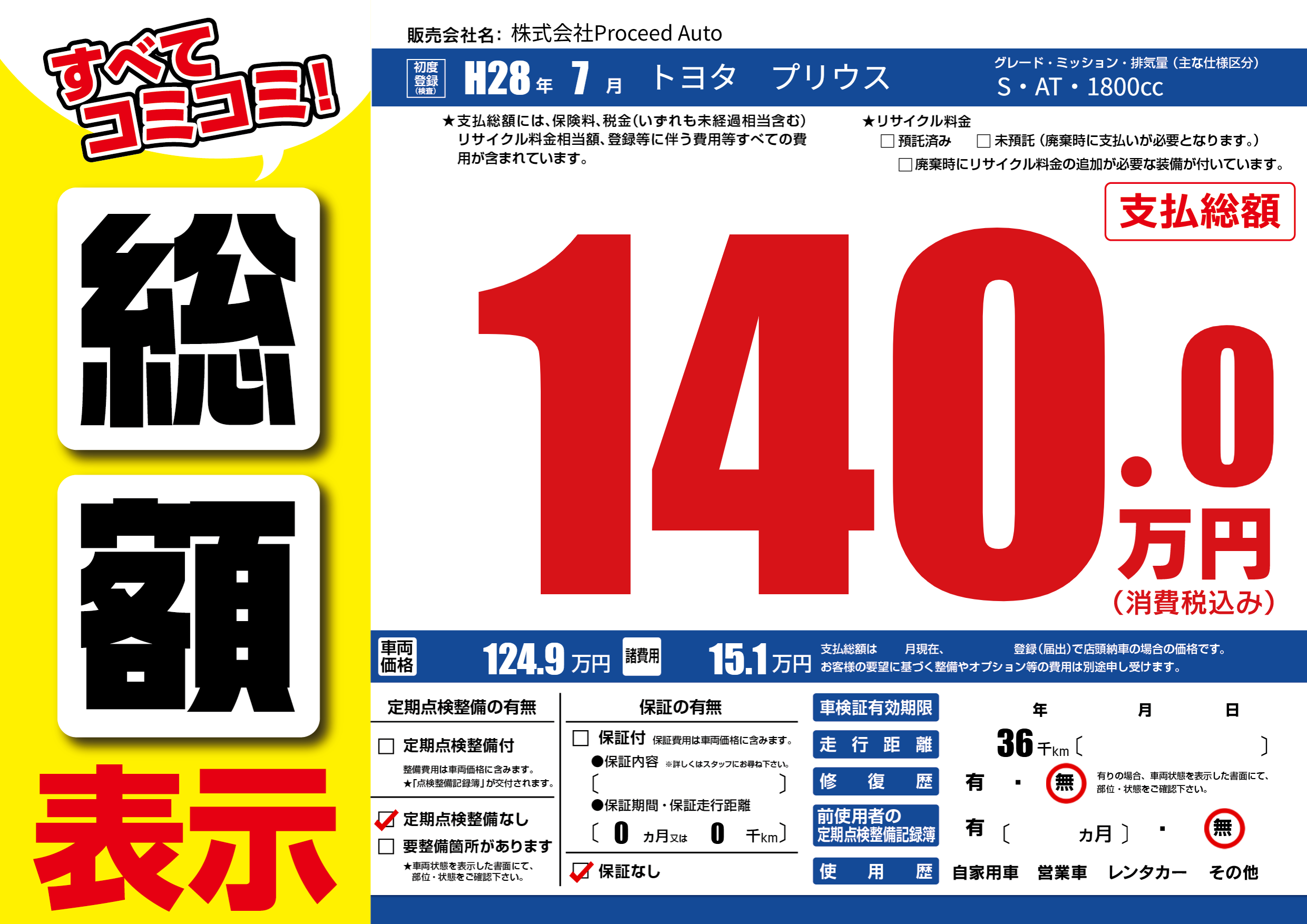 | 車名 | トヨタ プリウス | グレード ミッション 排気量 |