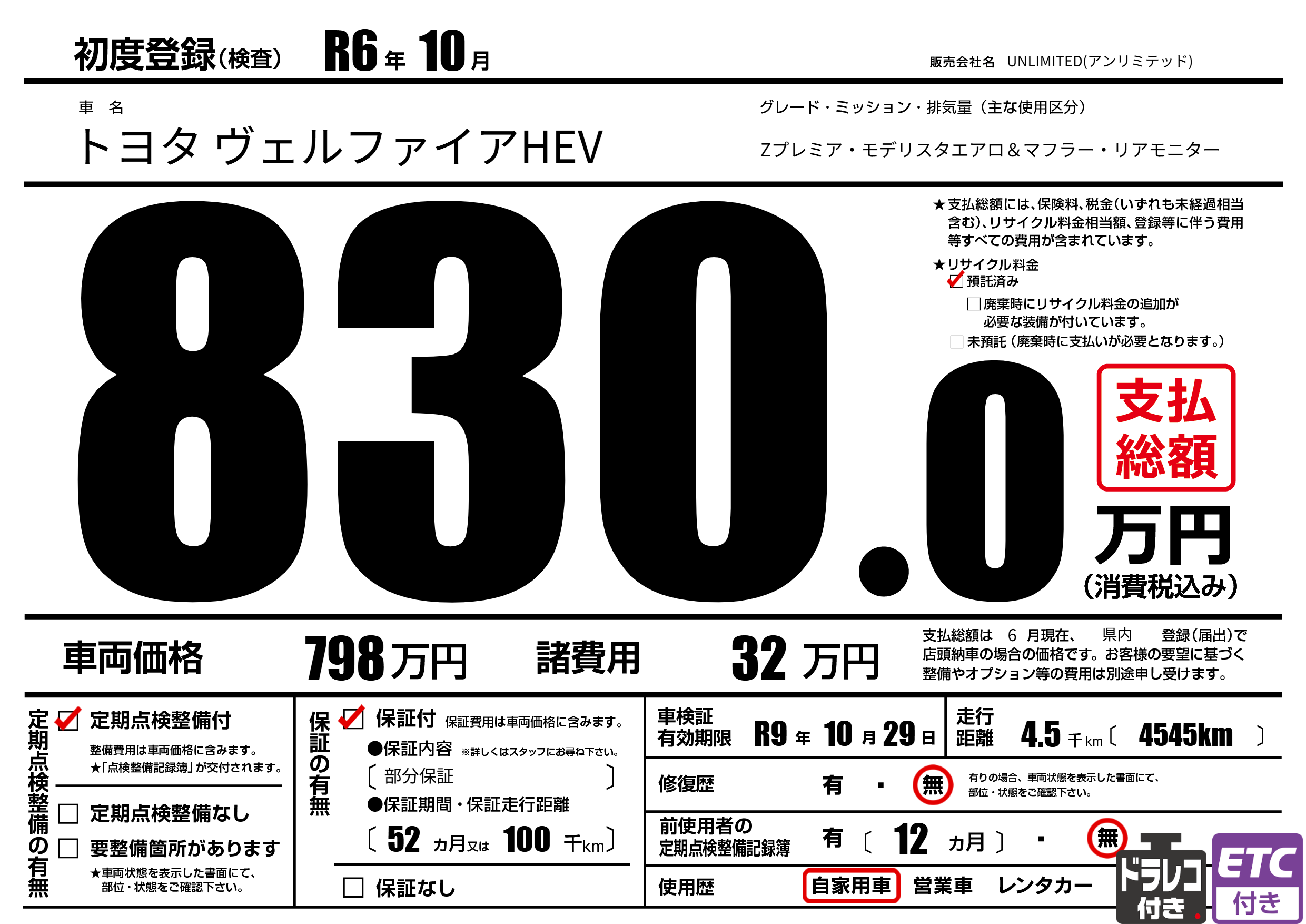 | 車名 | トヨタ ヴェルファイアHEV | グレード ミッション 排気量 |