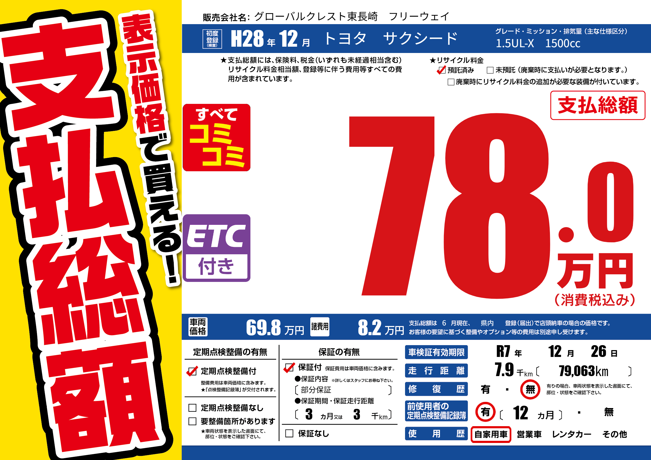 | 車名 | トヨタ サクシード | グレード ミッション 排気量 |