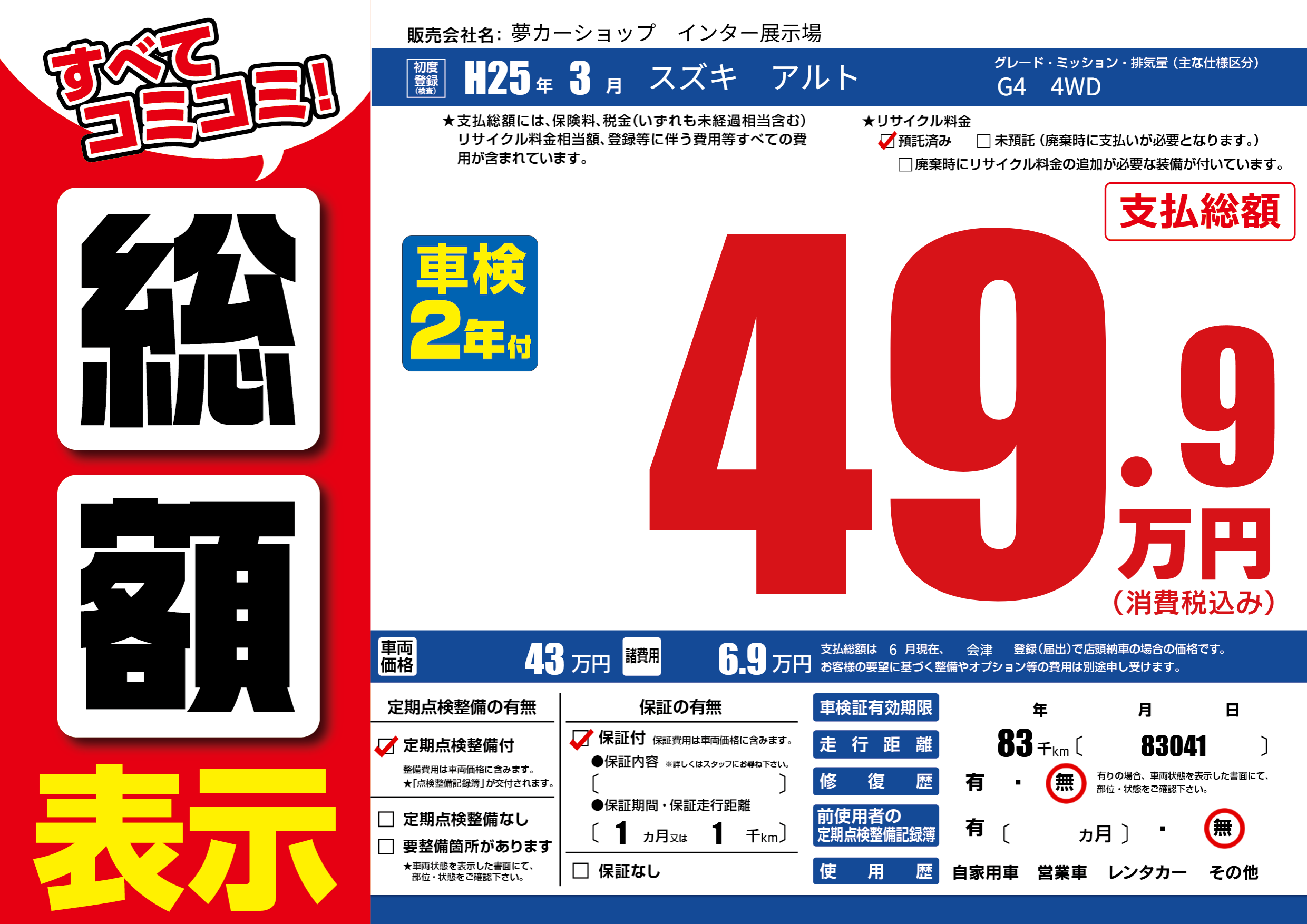 | 車名 | スズキ アルト | グレード ミッション 排気量 |