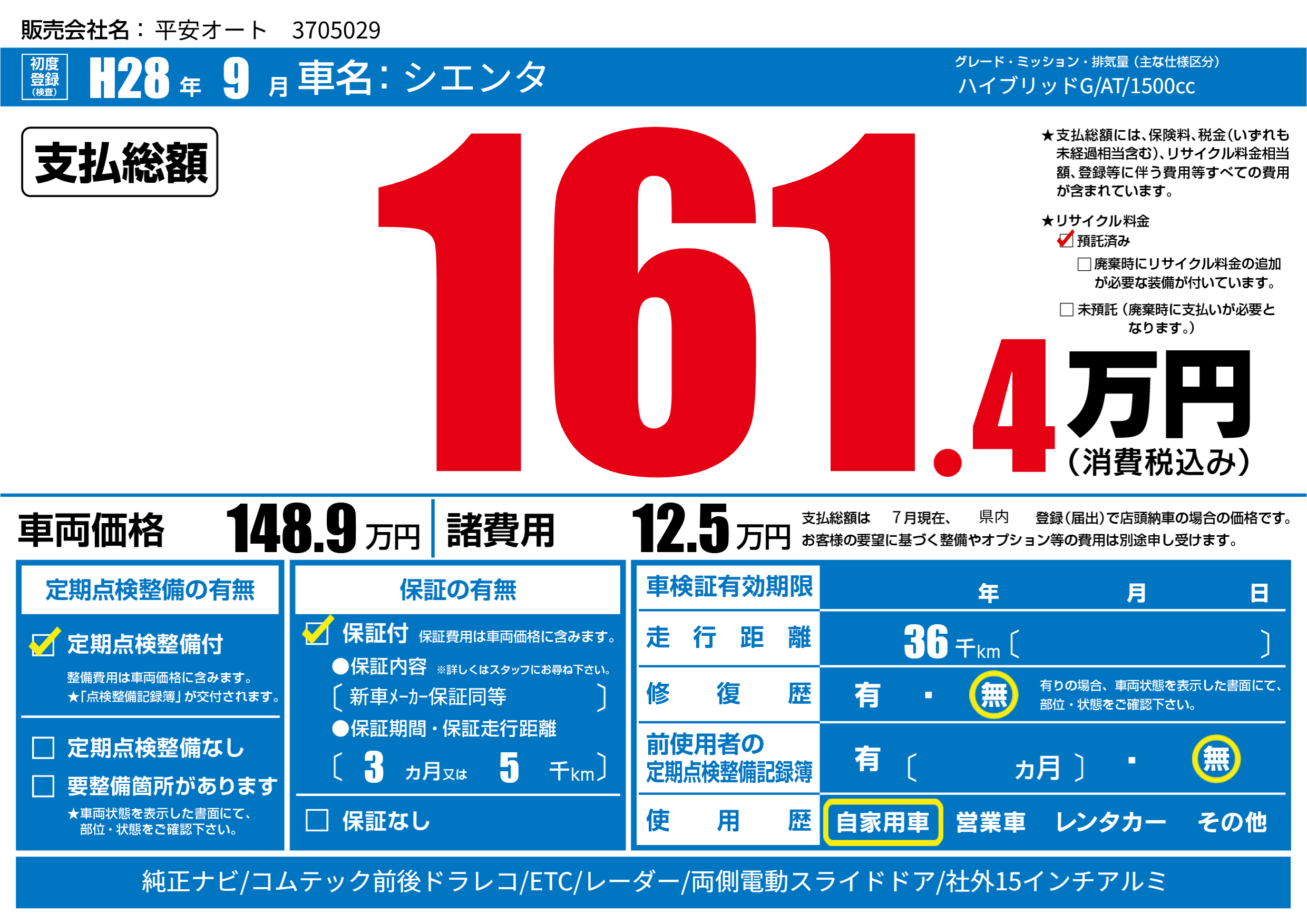 保証付き 保証内容(新車メーカー保証同等) 3ヶ月または(5)千kmまで |