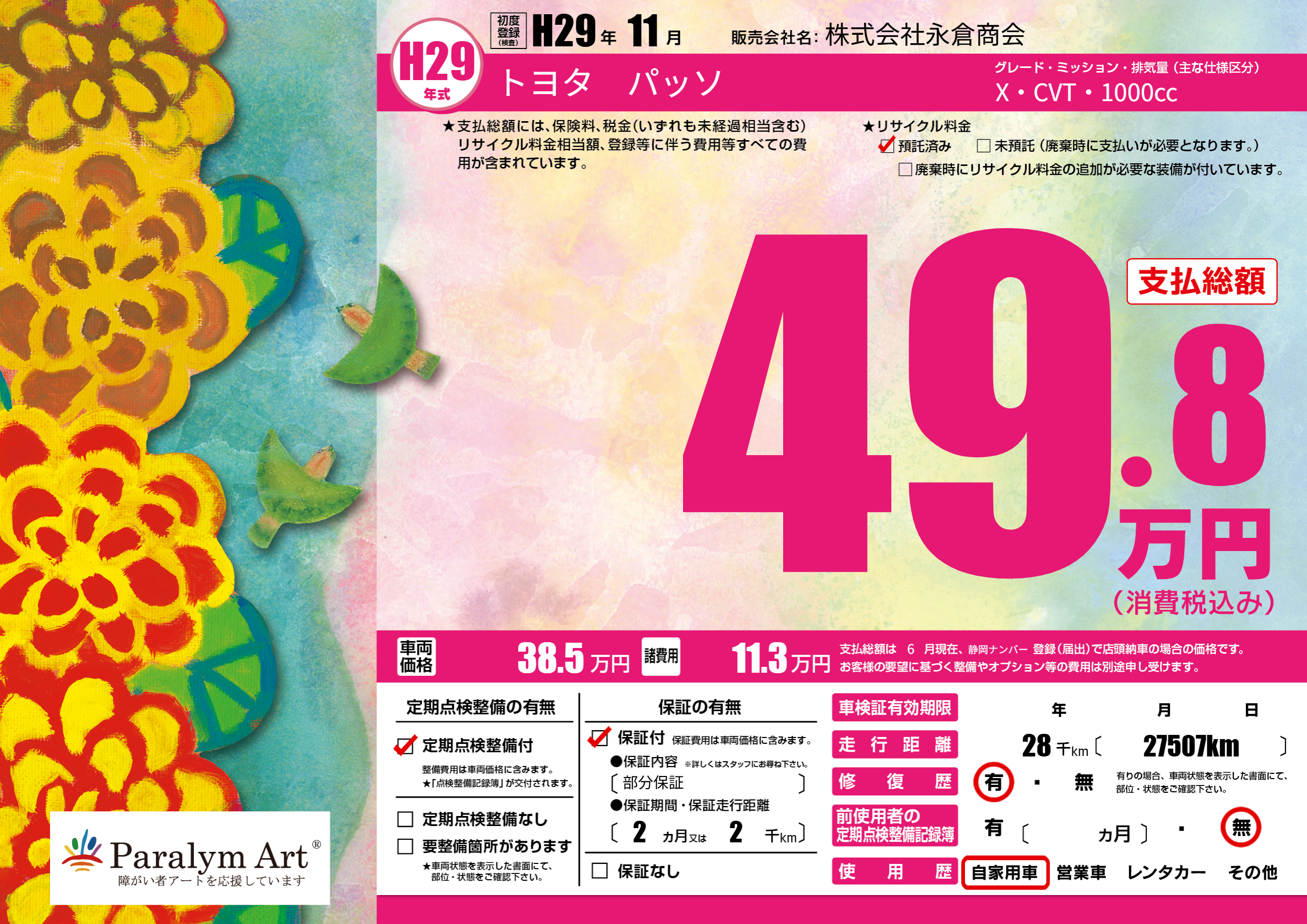 | 車名 | トヨタ パッソ | グレード ミッション 排気量 |