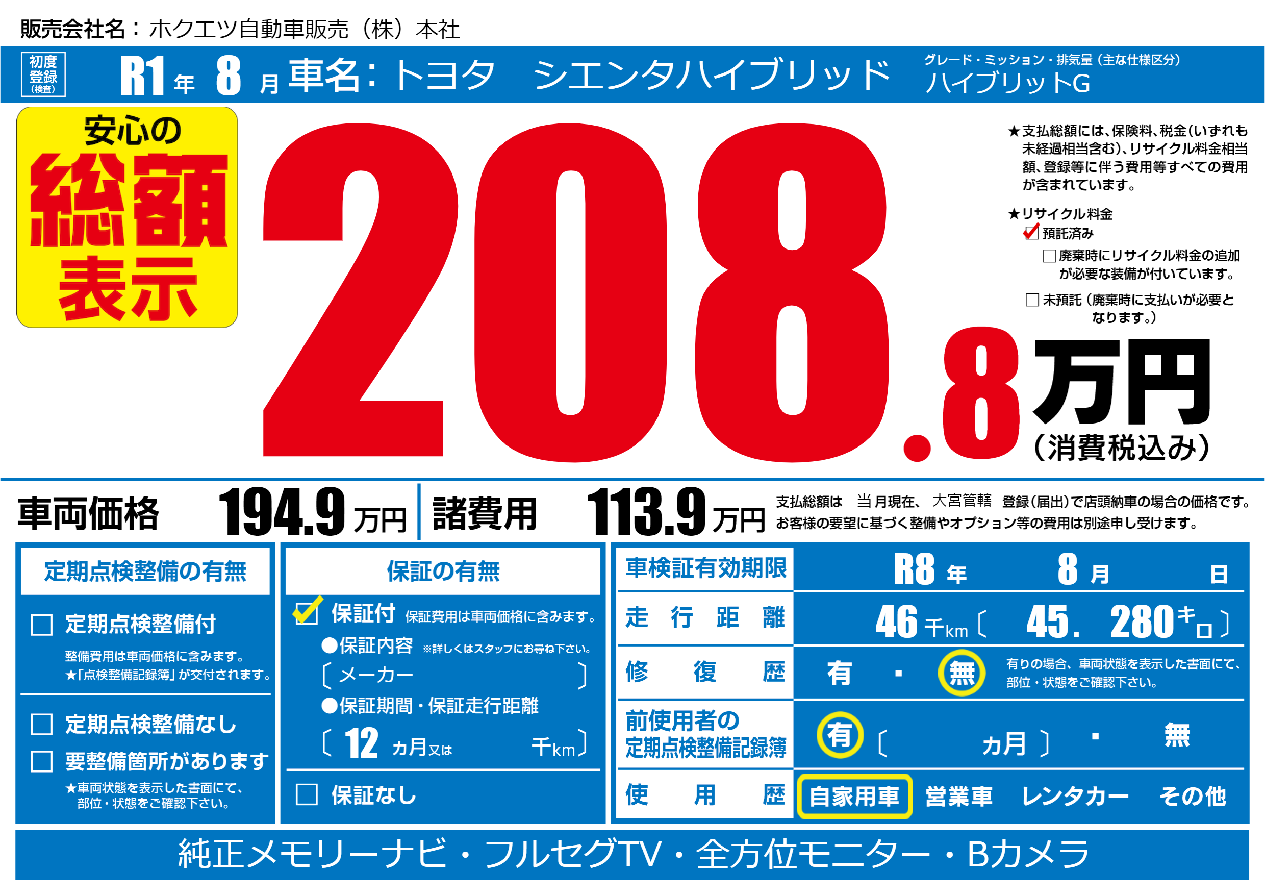 | 車名 | トヨタ シエンタハイブリッド | グレード ミッション 排気量 |