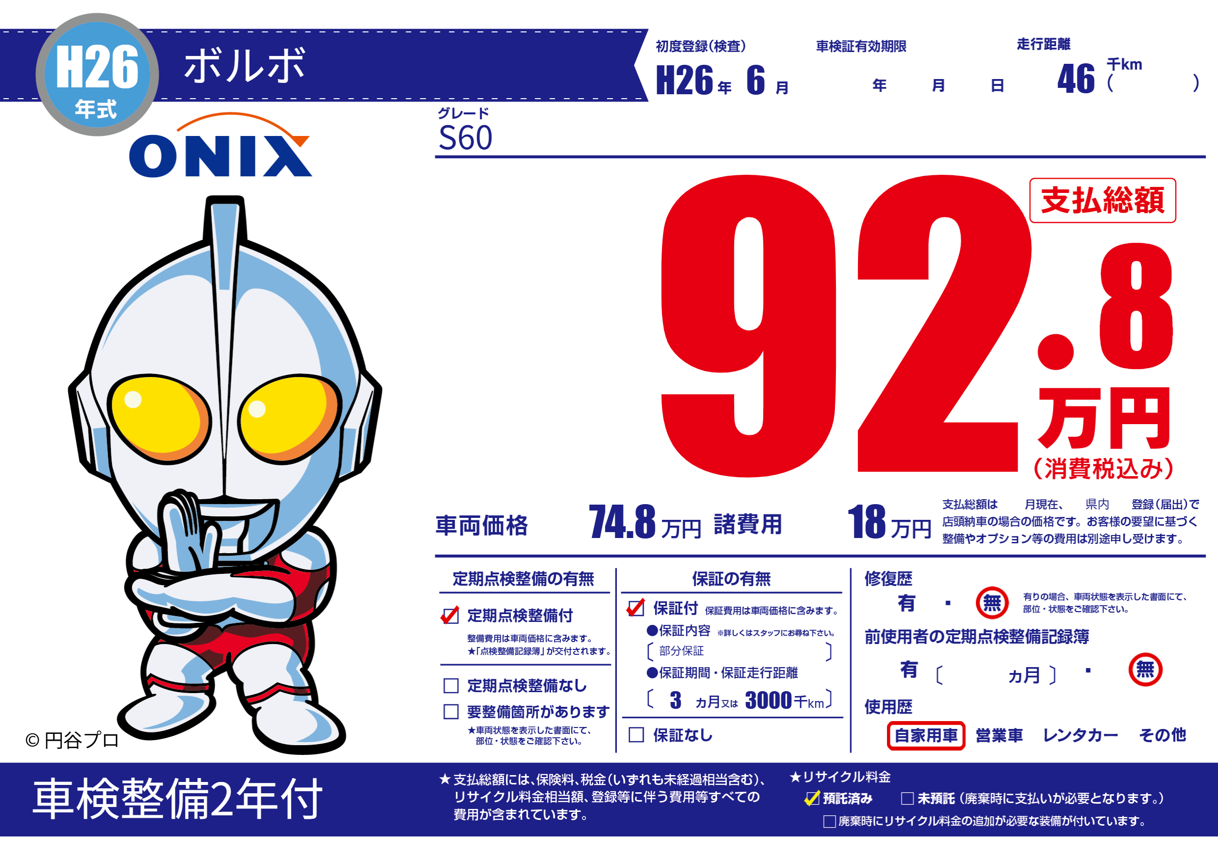 | 走行キロ | 4.6万km | 初年度登録 | H26年6月 |