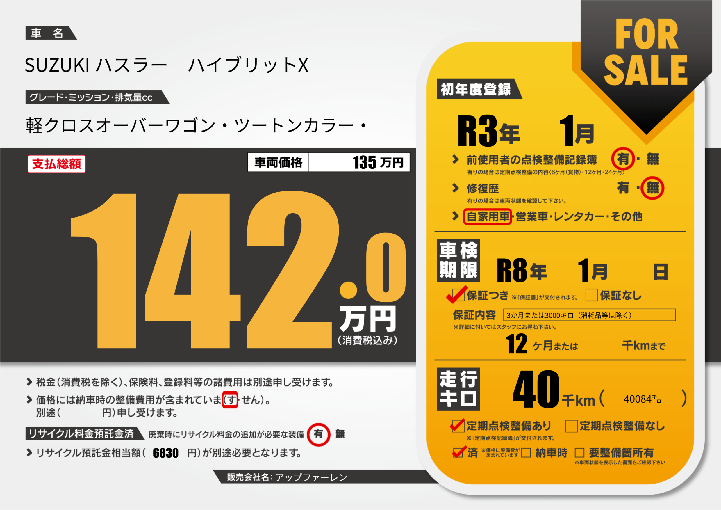 | 車名 | SUZUKI ハスラー ハイブリットX | グレード ミッション 排気量 |