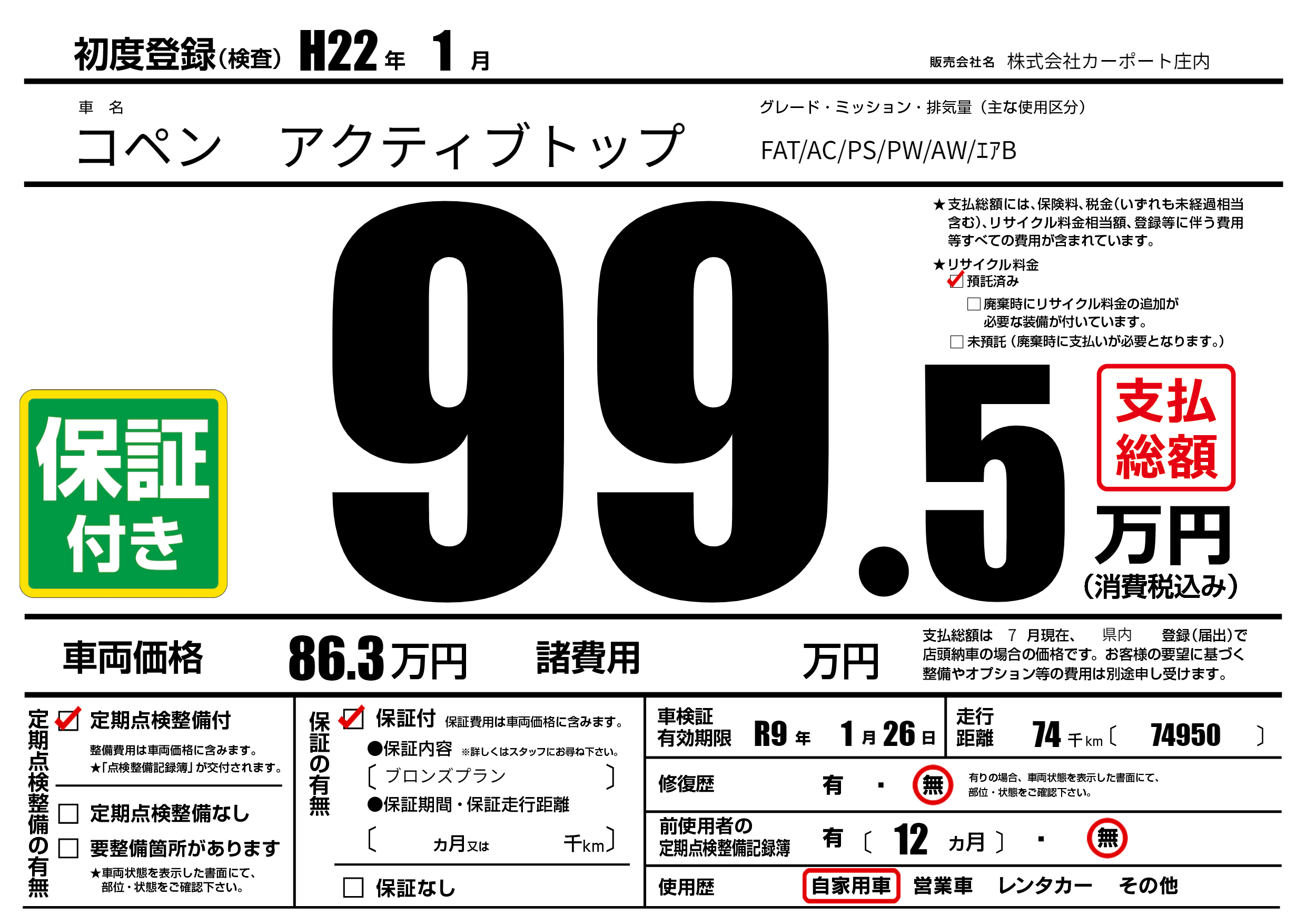 | 車名 | コペン アクティブトップ | グレード ミッション 排気量 |