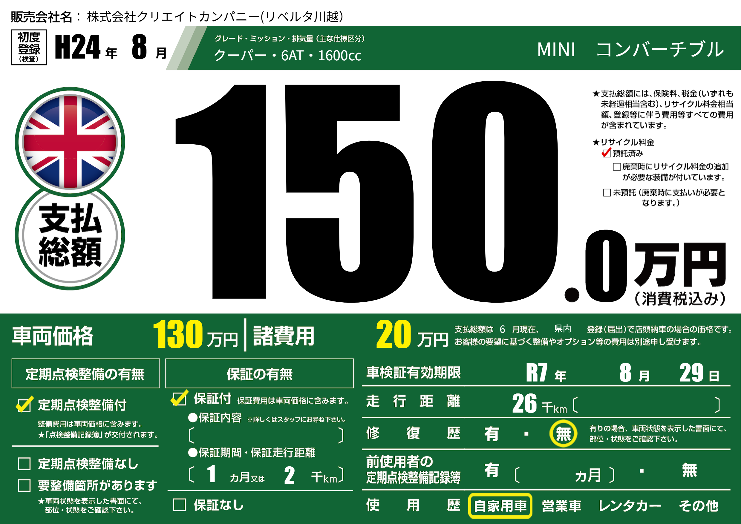 | 車名 | MINI コンバーチブル | グレード ミッション 排気量 |