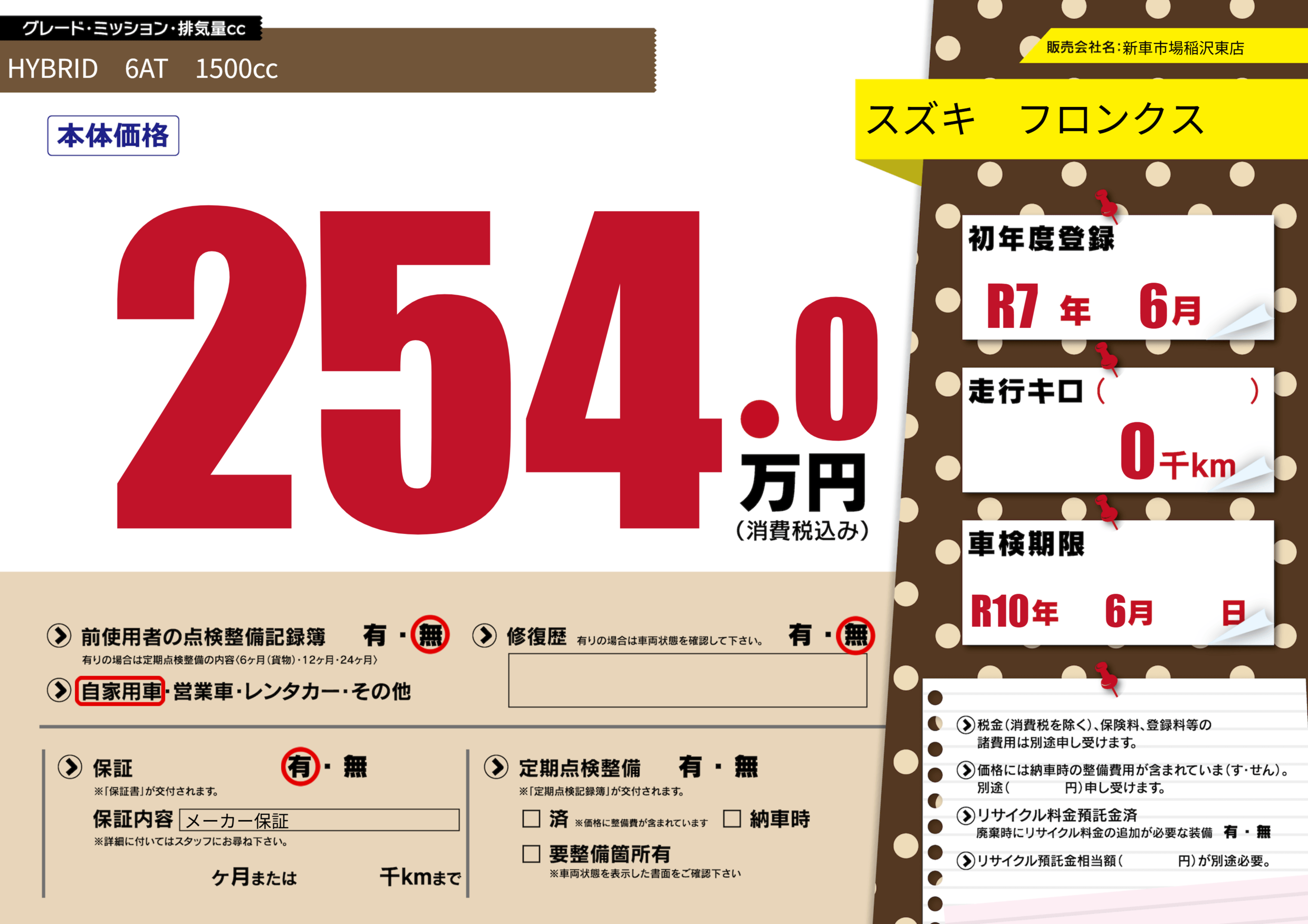 | 車検制限 | R10年 6月 - 日 | ||