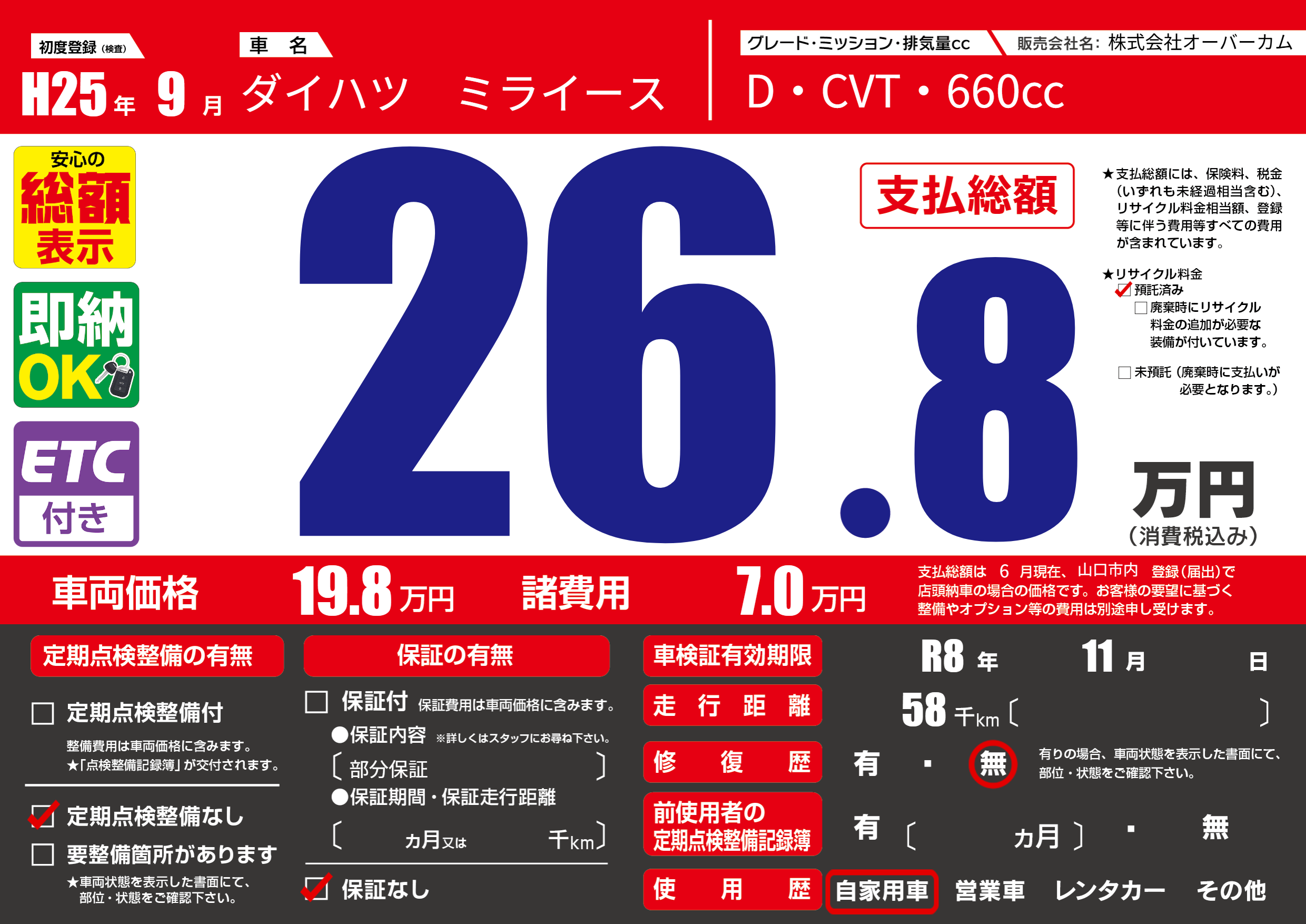 | 走行キロ | 5.8万km | 初年度登録 | H25年9月 |
