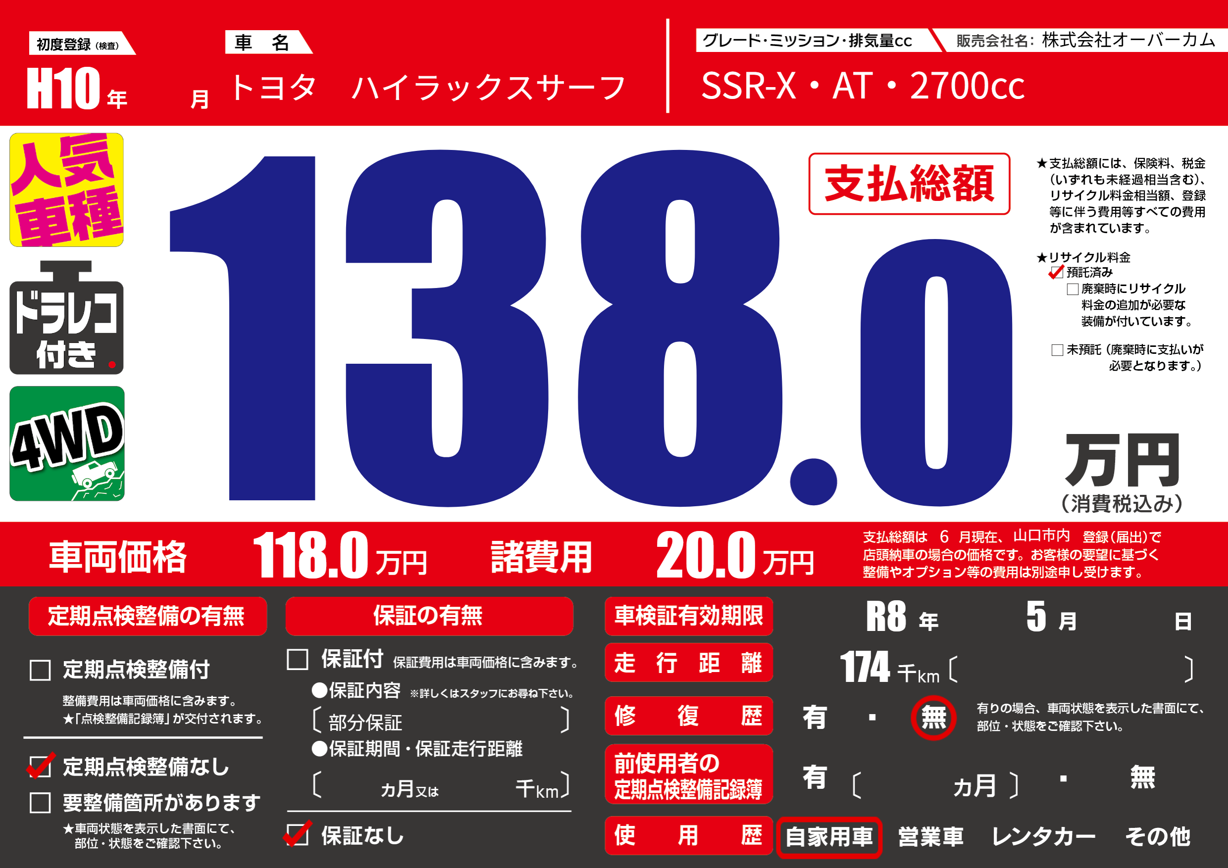 | 車名 | トヨタ ハイラックスサーフ | グレード ミッション 排気量 |