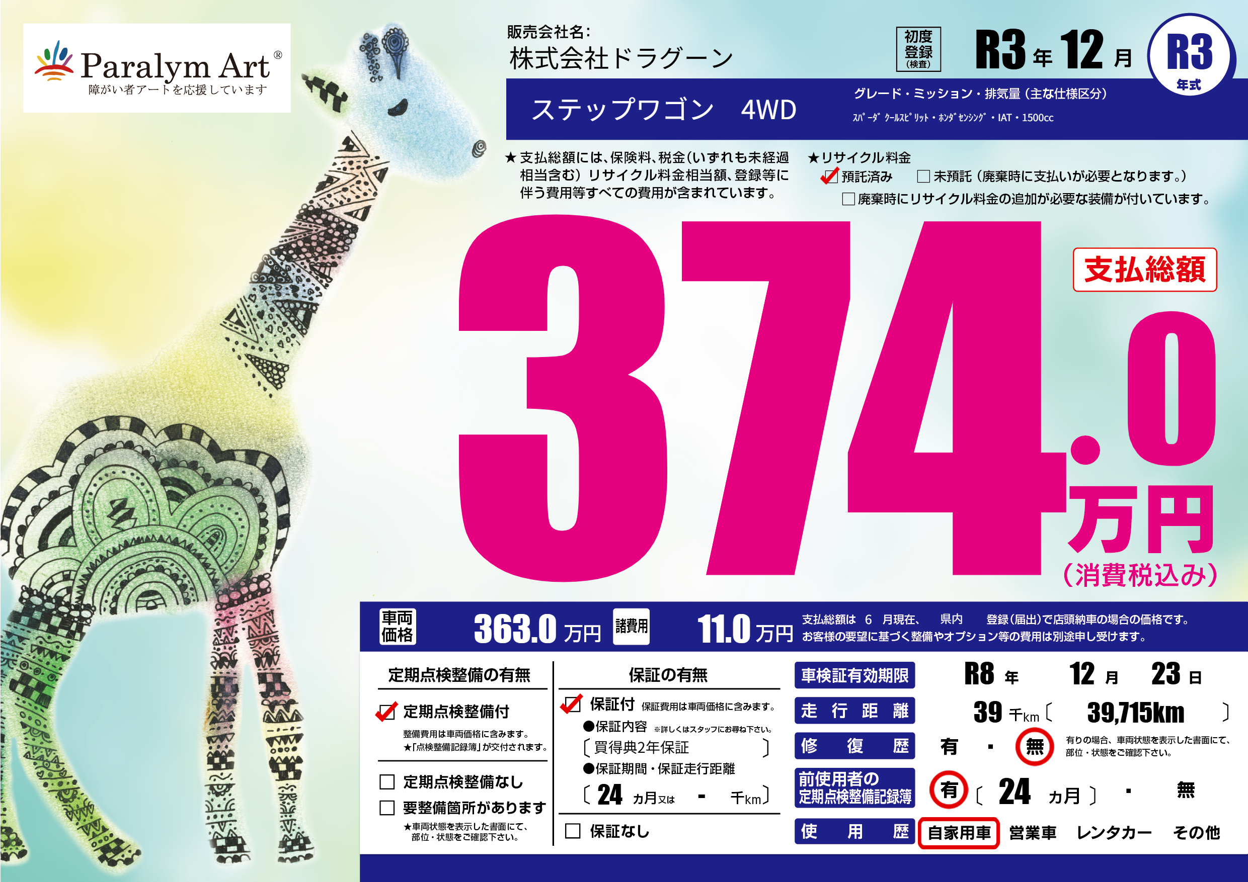 | 走行キロ | 3.9万km | 初年度登録 | R3年12月 |
