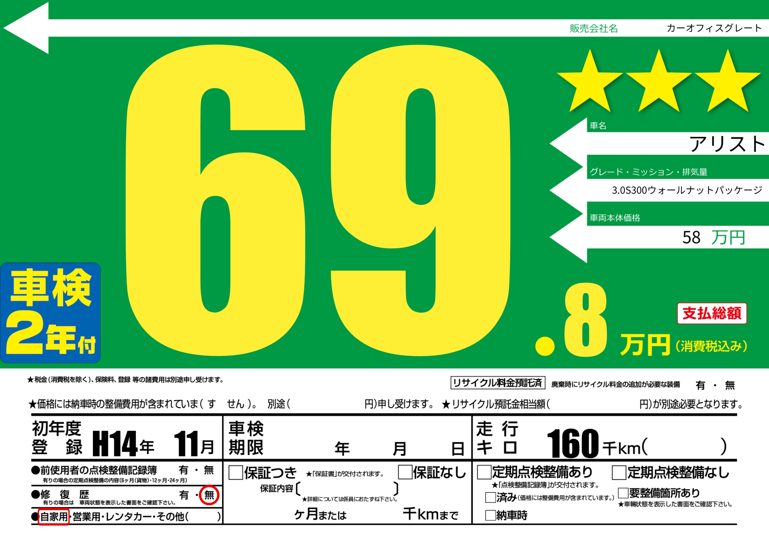 | 車名 | アリスト | グレード ミッション 排気量 |