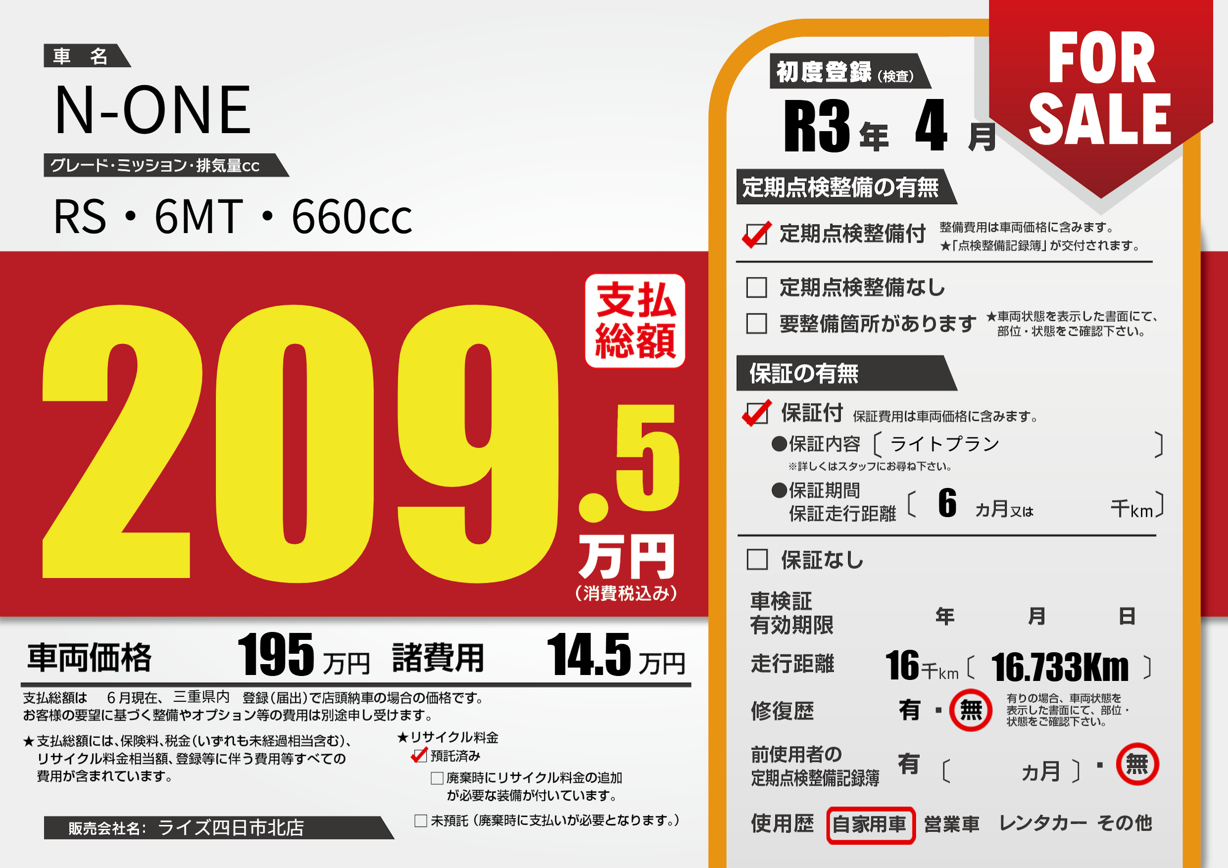 | 車名 | N-ONE | グレード ミッション 排気量 |
