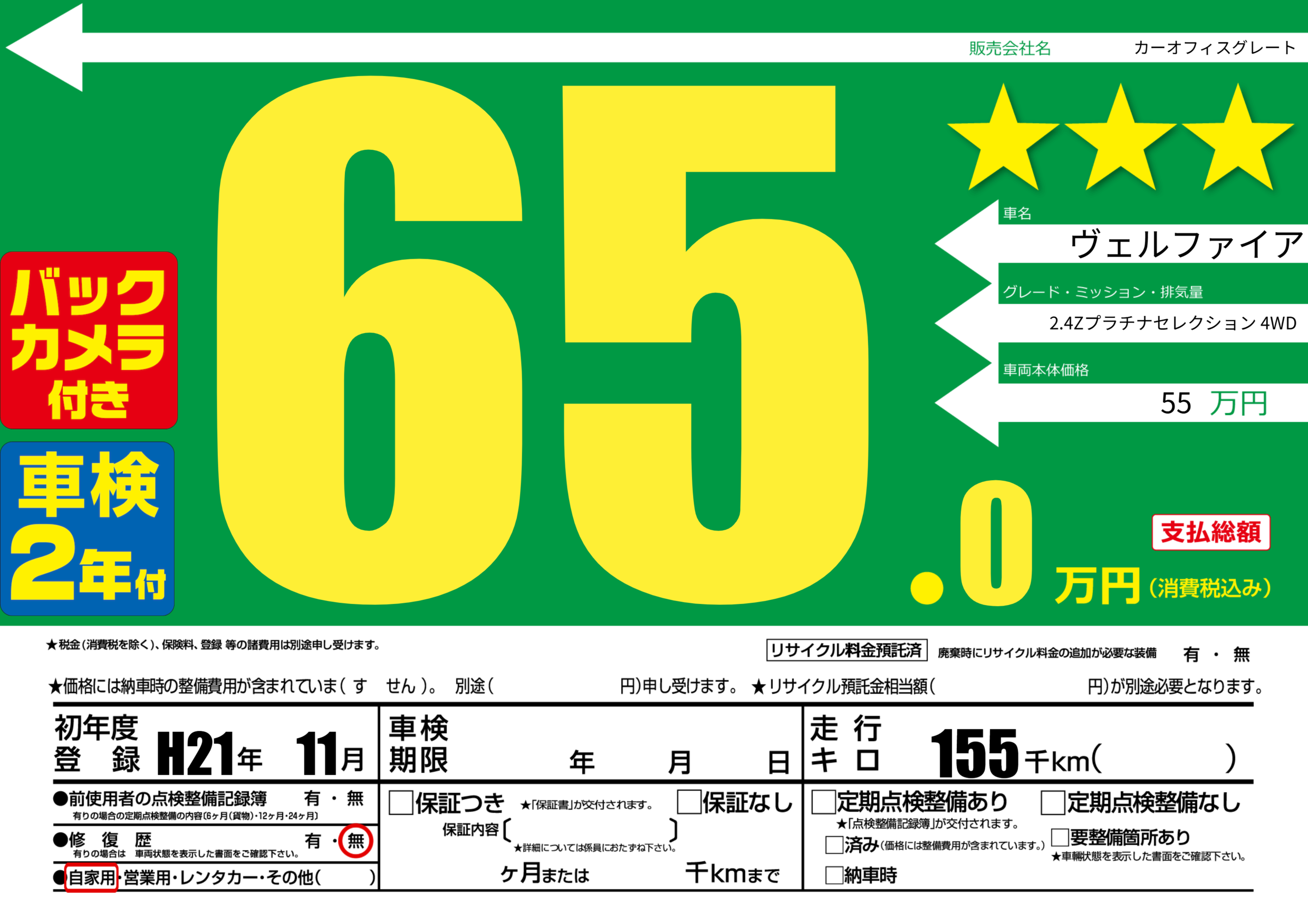 | 車名 | ヴェルファイア | グレード ミッション 排気量 |