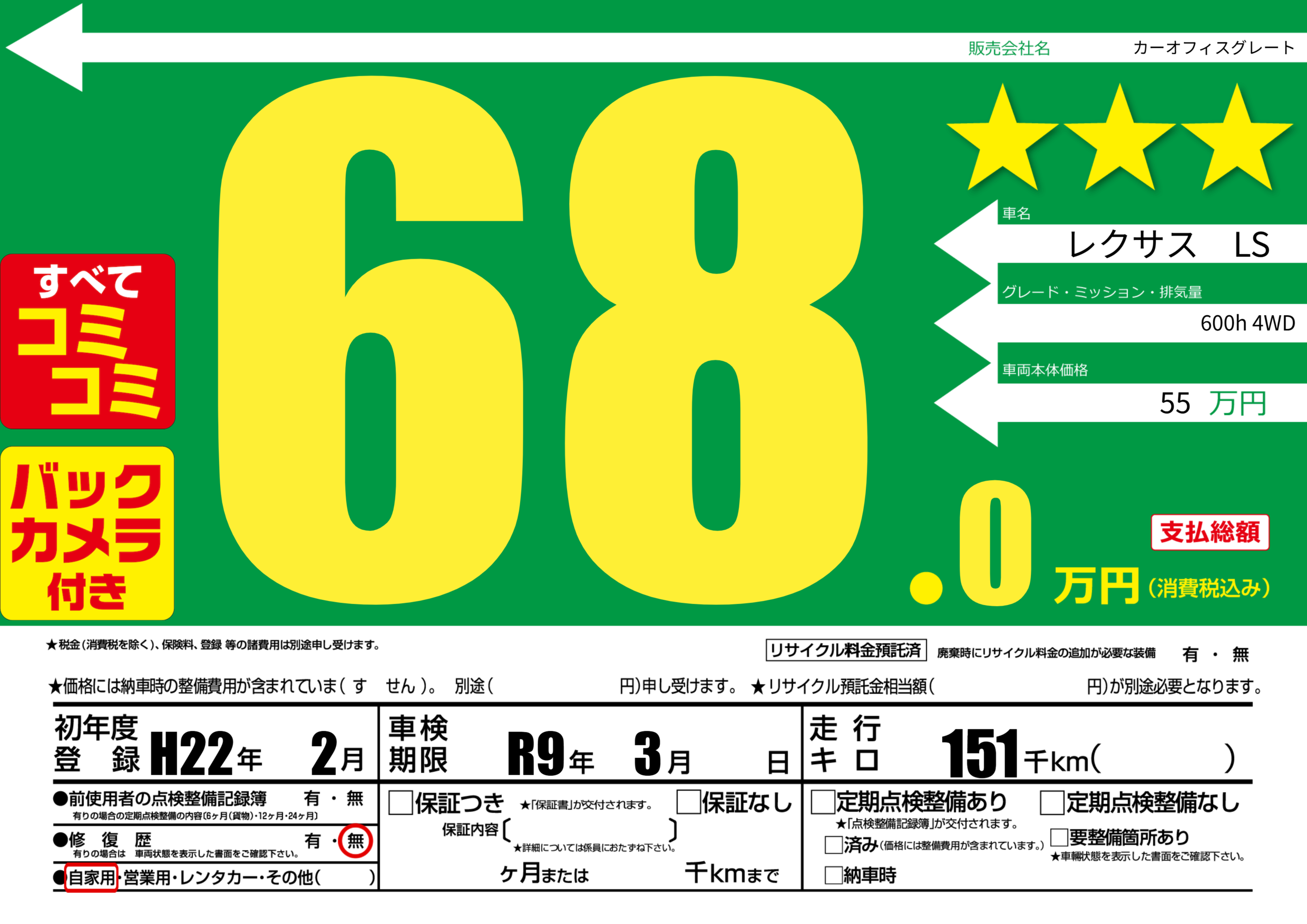 | 走行キロ | 15.1万km | 初年度登録 | H22年2月 |