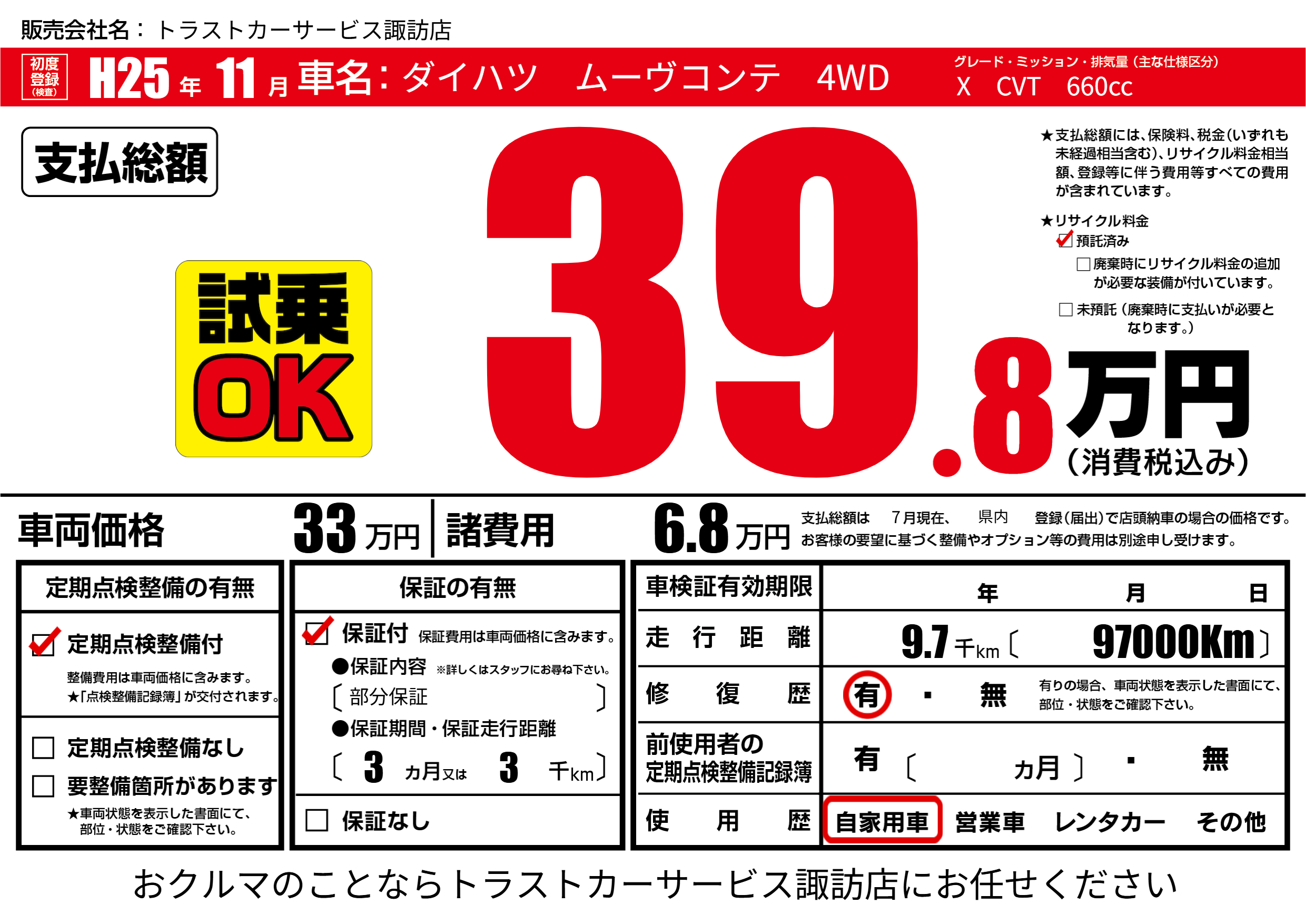 | 車名 | ダイハツ ムーヴコンテ 4WD | グレード ミッション 排気量 |