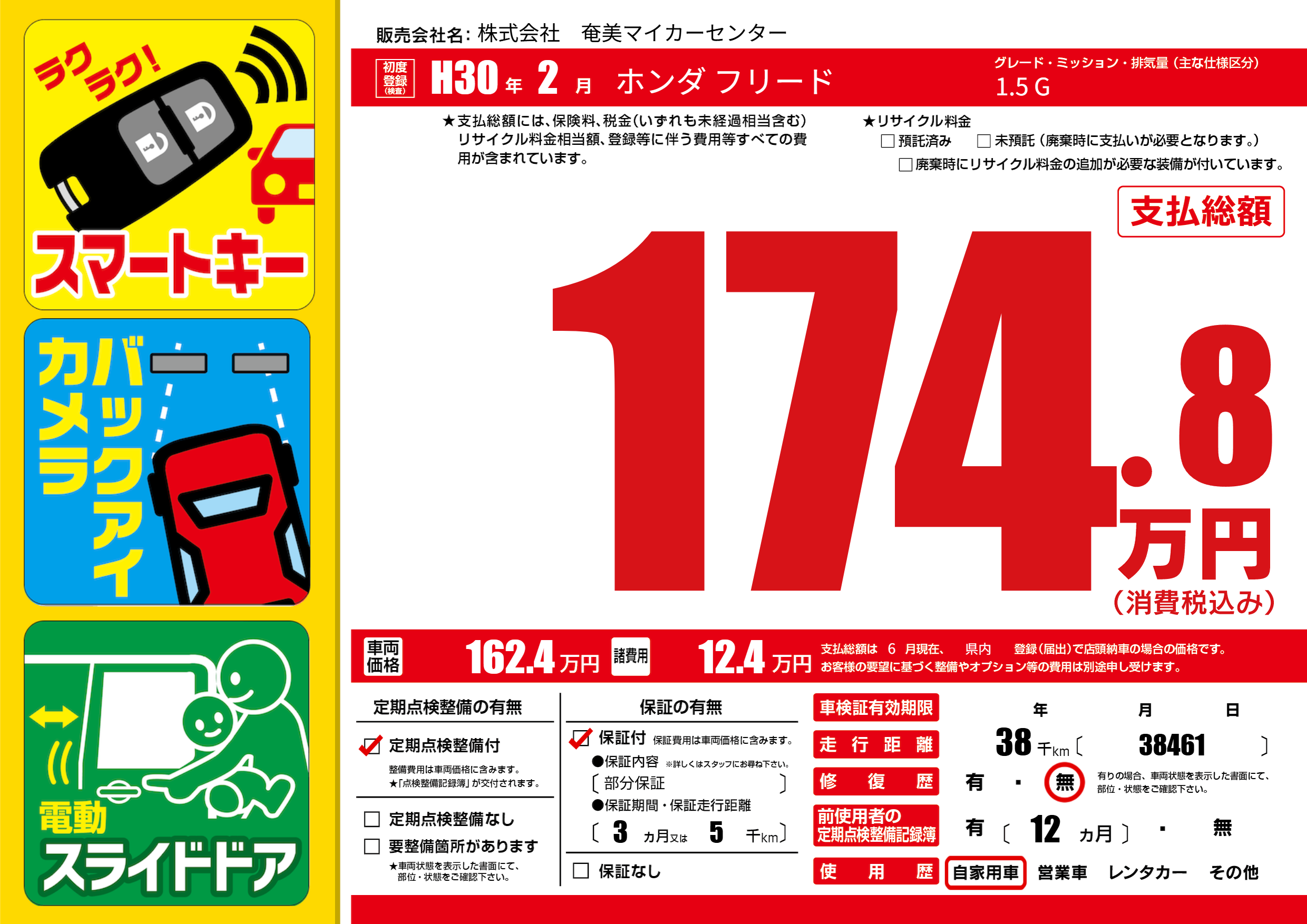 | 車名 | ホンダ フリード | グレード ミッション 排気量 |