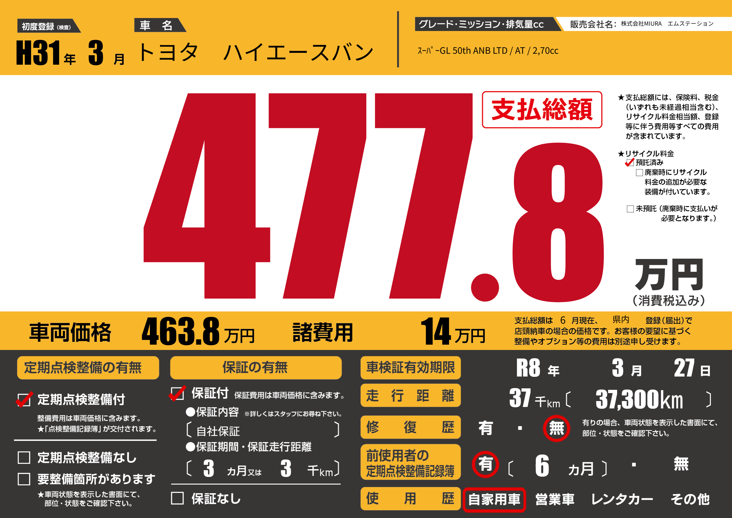 | 走行キロ | 3.7万km | 初年度登録 | H31年3月 |