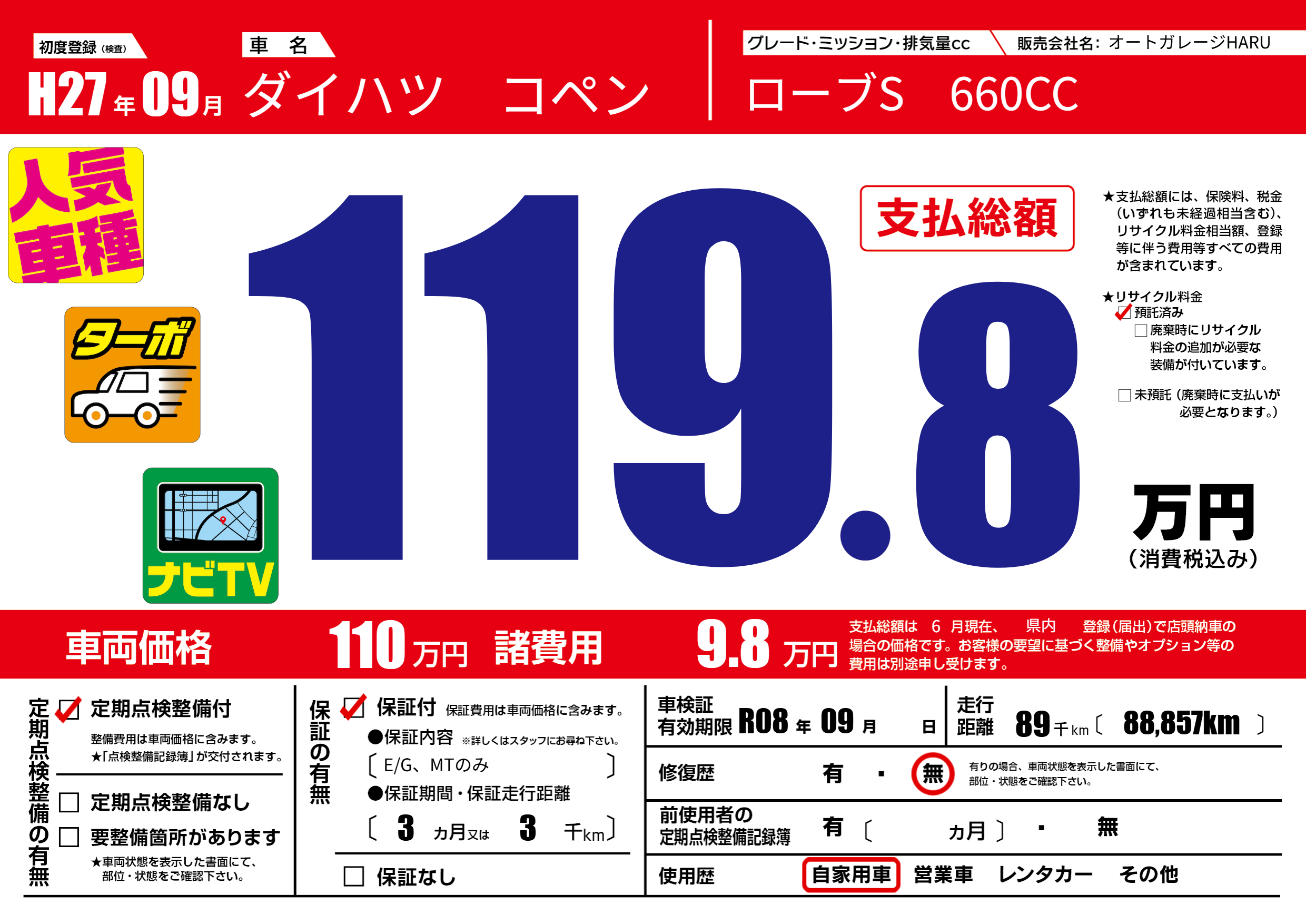 | 車名 | ダイハツ コペン | グレード ミッション 排気量 |