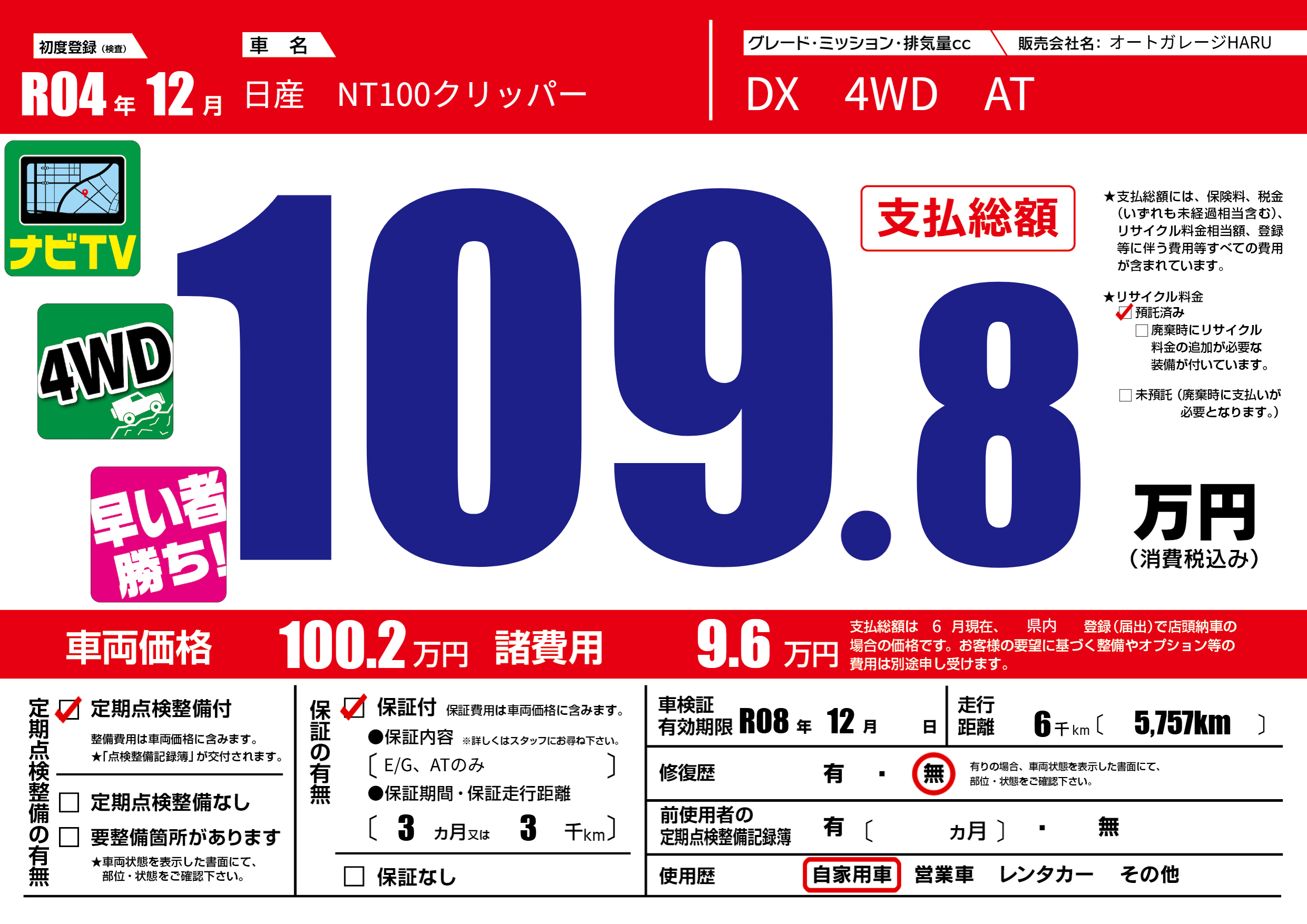 | 車名 | 日産 NT100クリッパー | グレード ミッション 排気量 |