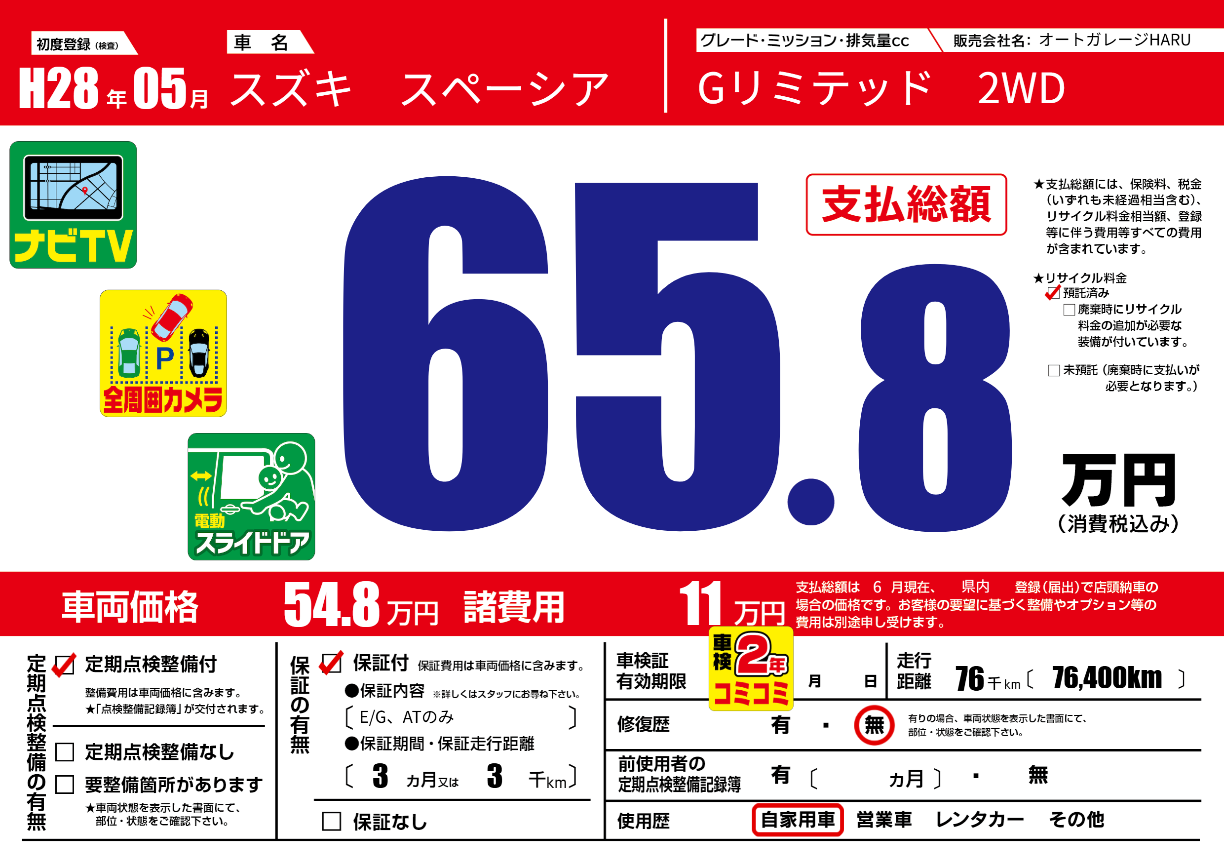 | 走行キロ | 7.6万km | 初年度登録 | H28年05月 |