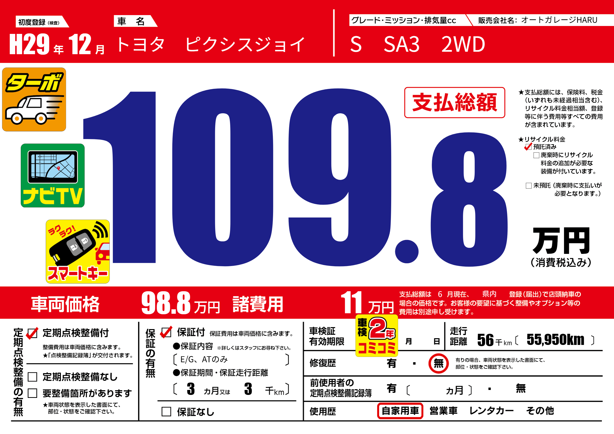 | 車名 | トヨタ ピクシスジョイ | グレード ミッション 排気量 |