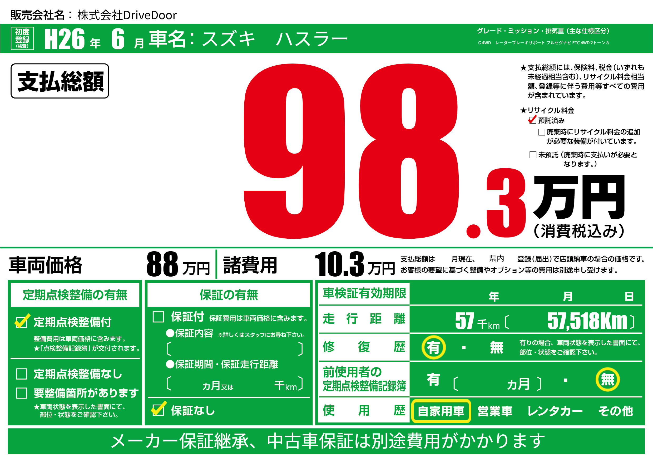 | 車名 | スズキ ハスラー | グレード ミッション 排気量 |
