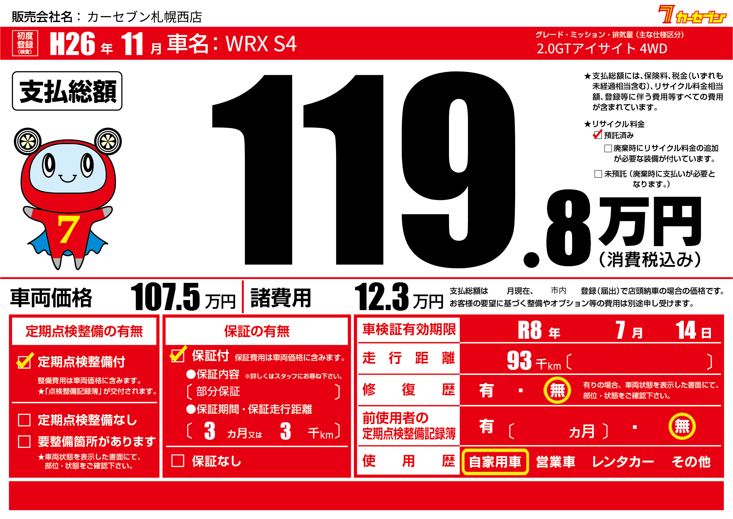 | 車名 | WRX S4 | グレード ミッション 排気量 |