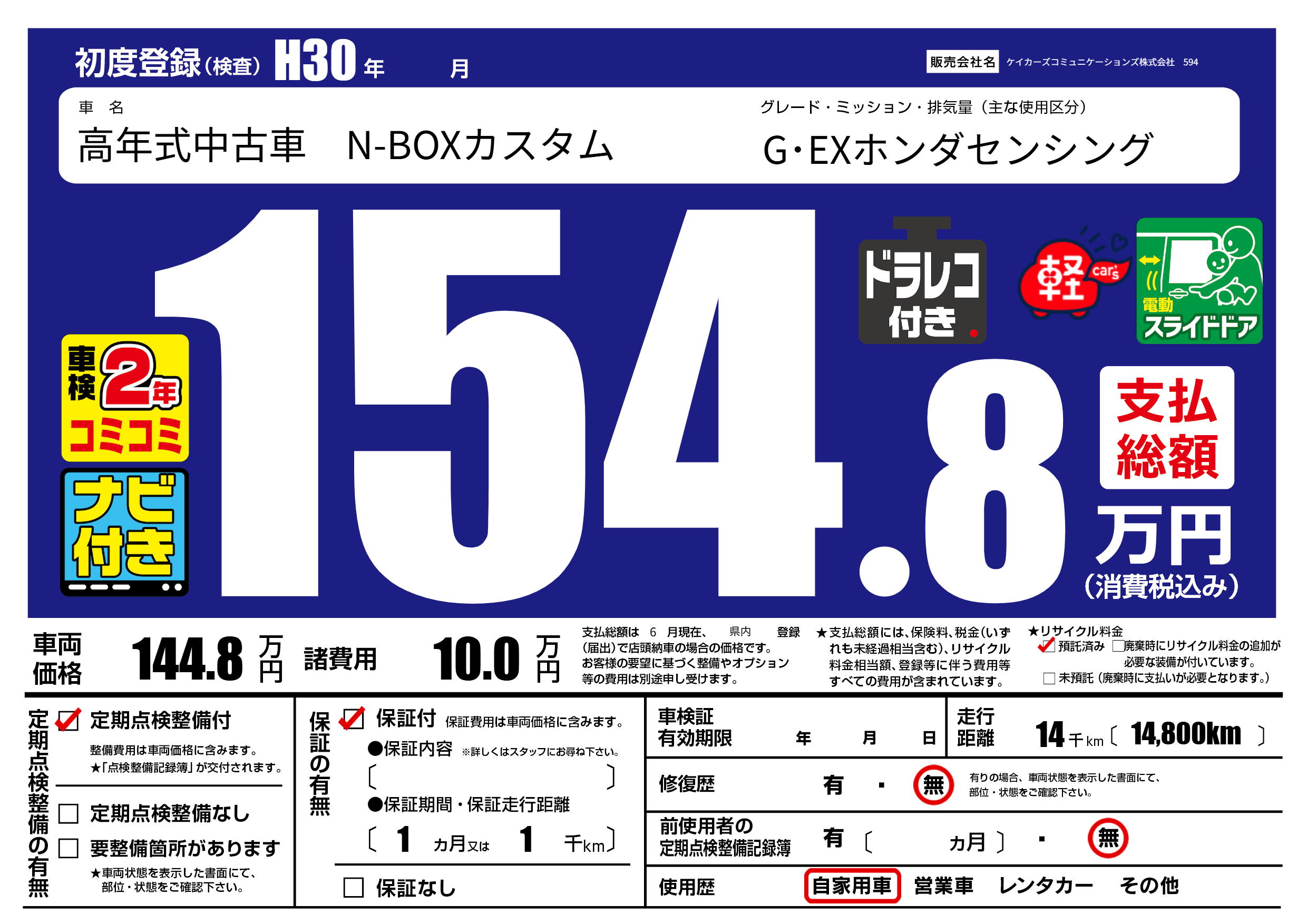 | 走行キロ | 1.4万km | 初年度登録 | H30年---月 |