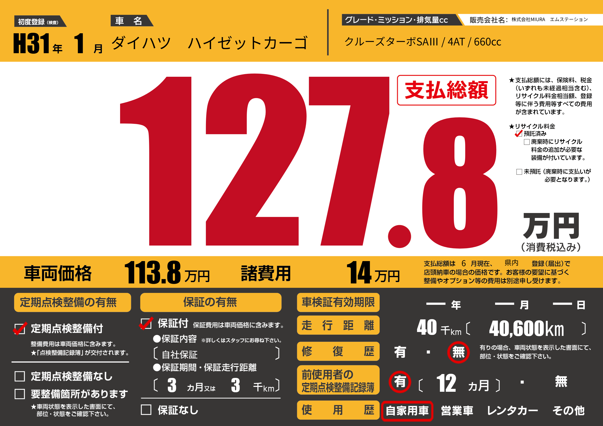 | 走行キロ | 4万km | 初年度登録 | H31年1月 |