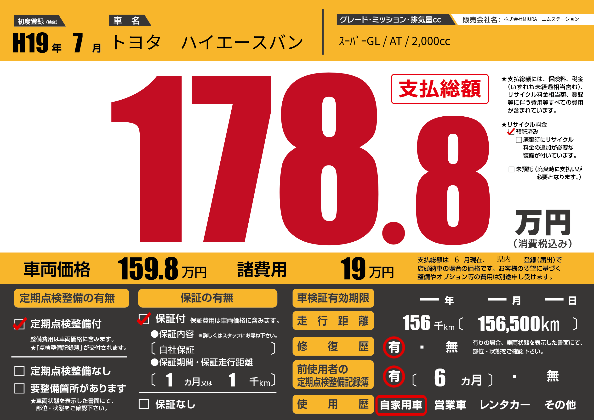 | 走行キロ | 15.6万km | 初年度登録 | H19年7月 |
