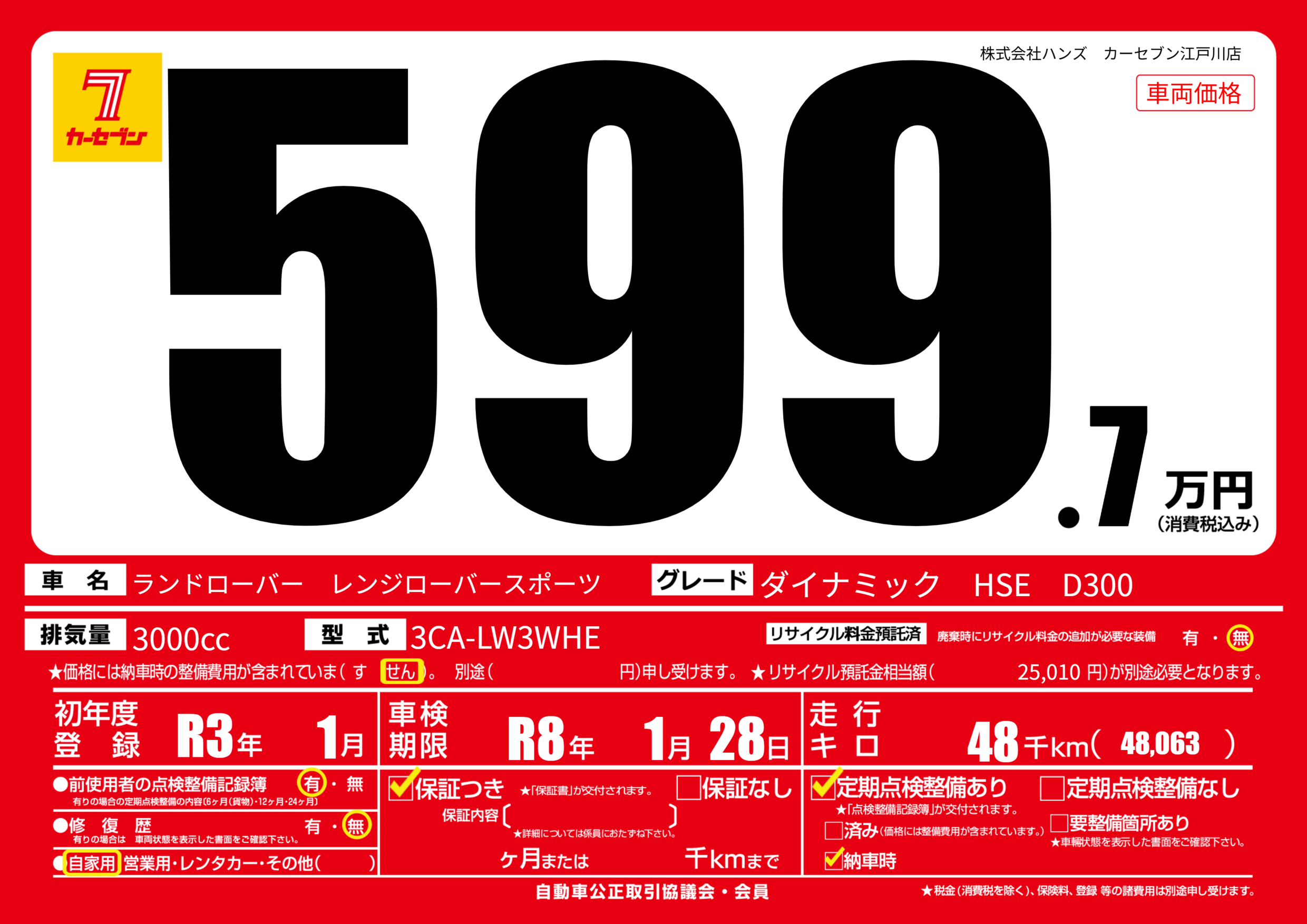 | 車名 | ランドローバー レンジローバースポーツ | グレード ミッション 排気量 |