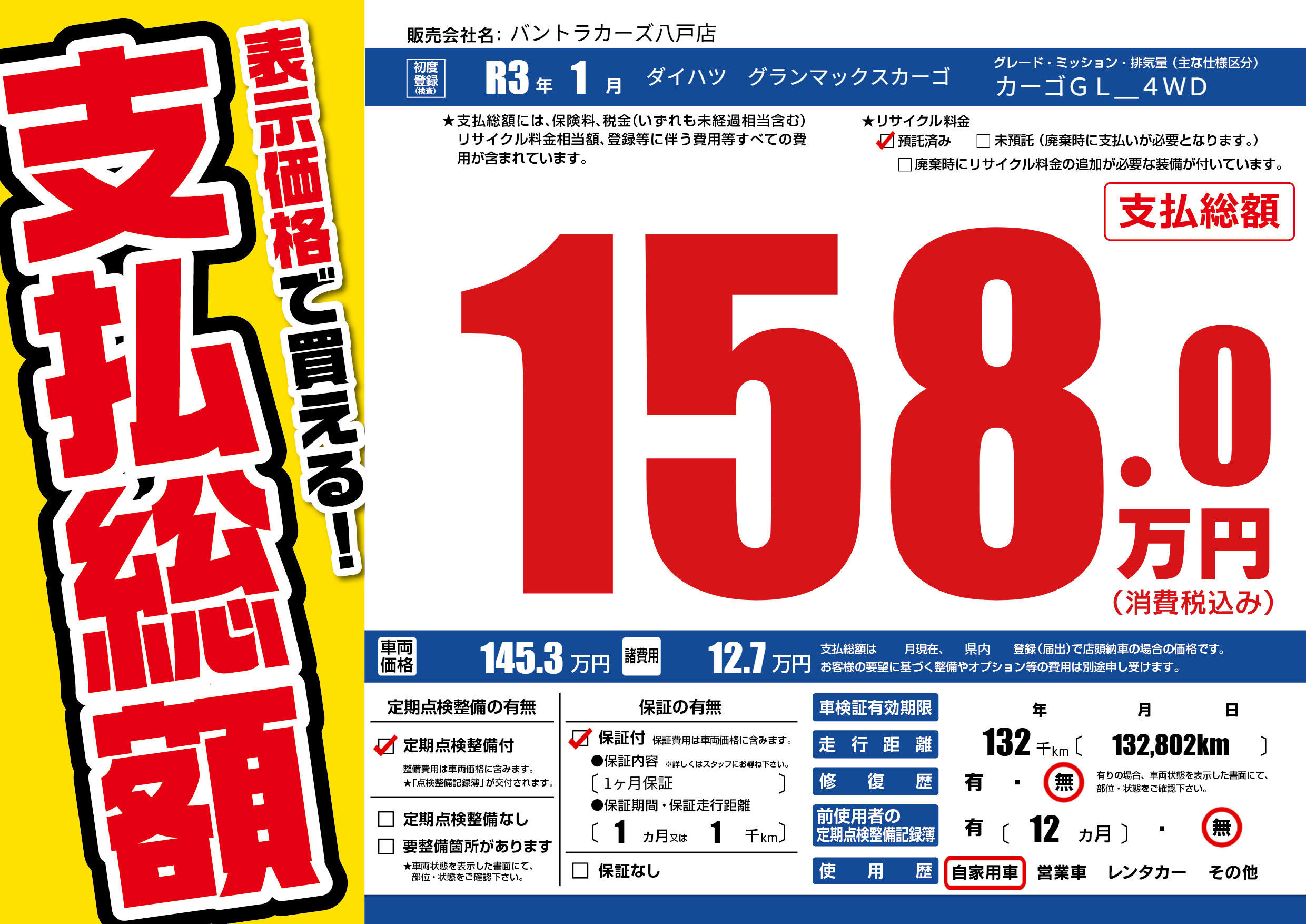 | 走行キロ | 13.2万km | 初年度登録 | R3年1月 |