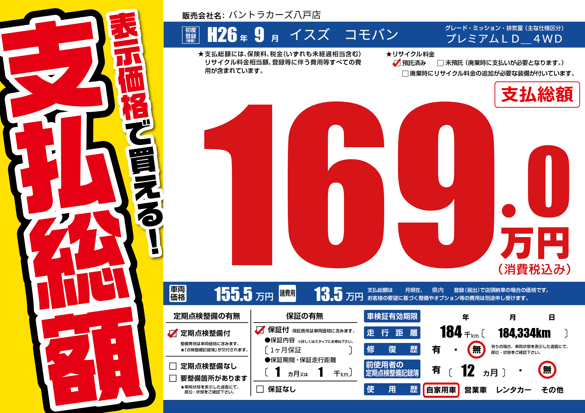 | 走行キロ | 18.4万km | 初年度登録 | H26年9月 |