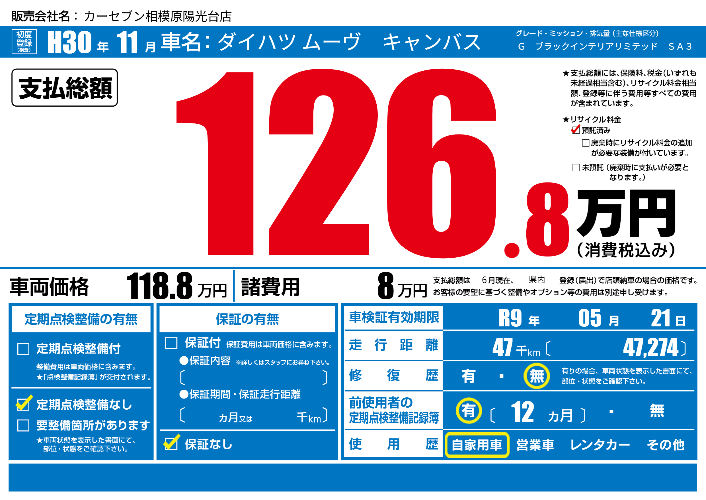 | 車検制限 | R9年 05月 21日 | ||