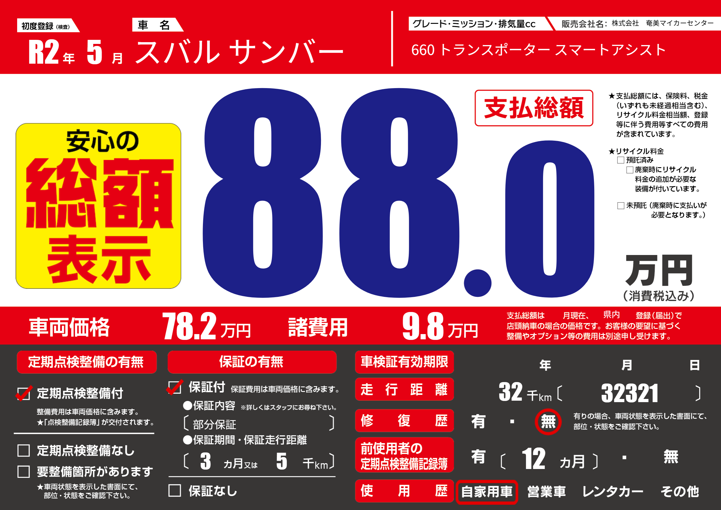 | 車名 | スバル サンバー | グレード ミッション 排気量 |