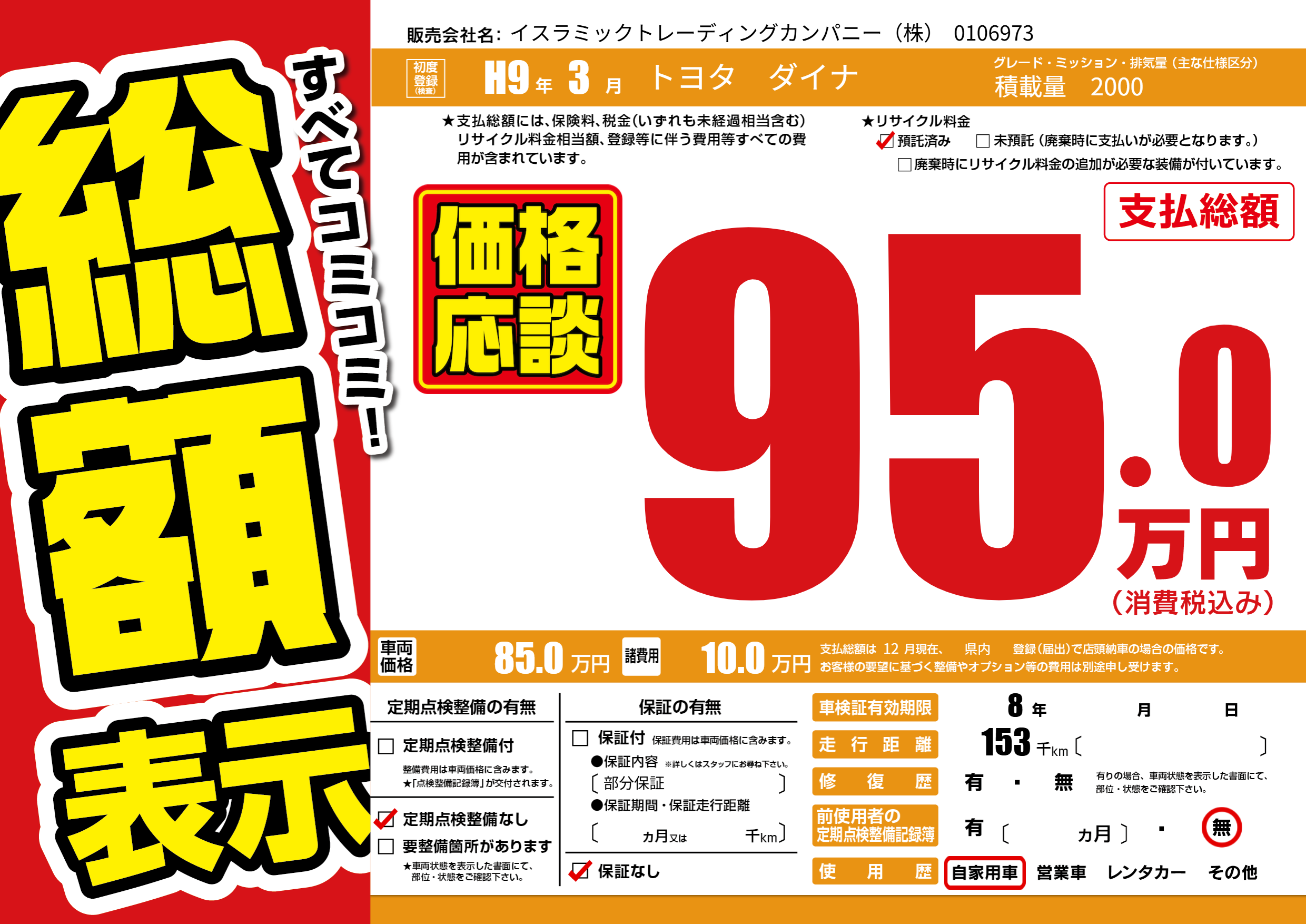 | 走行キロ | 15.3万km | 初年度登録 | H9年3月 |