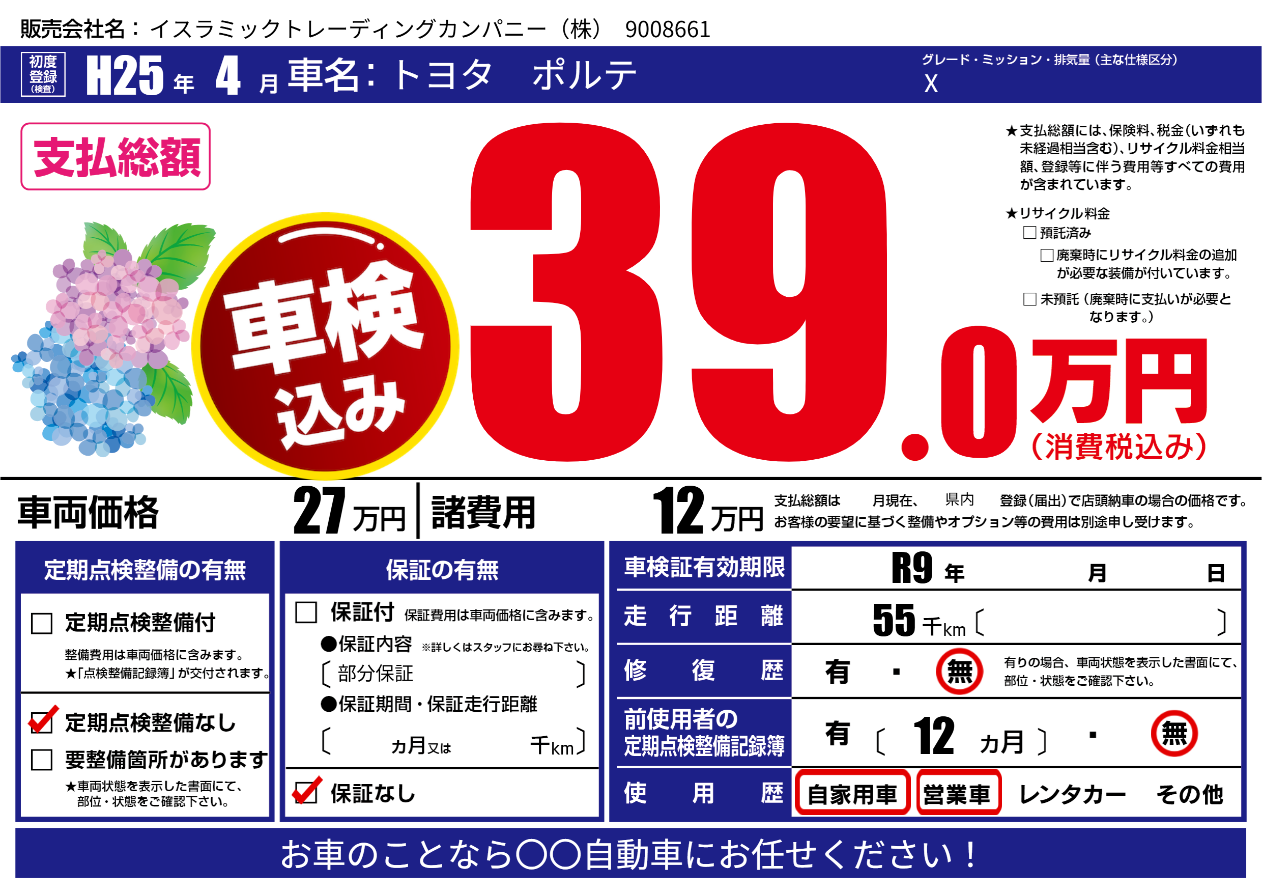 | 車名 | トヨタ ポルテ | グレード ミッション 排気量 |