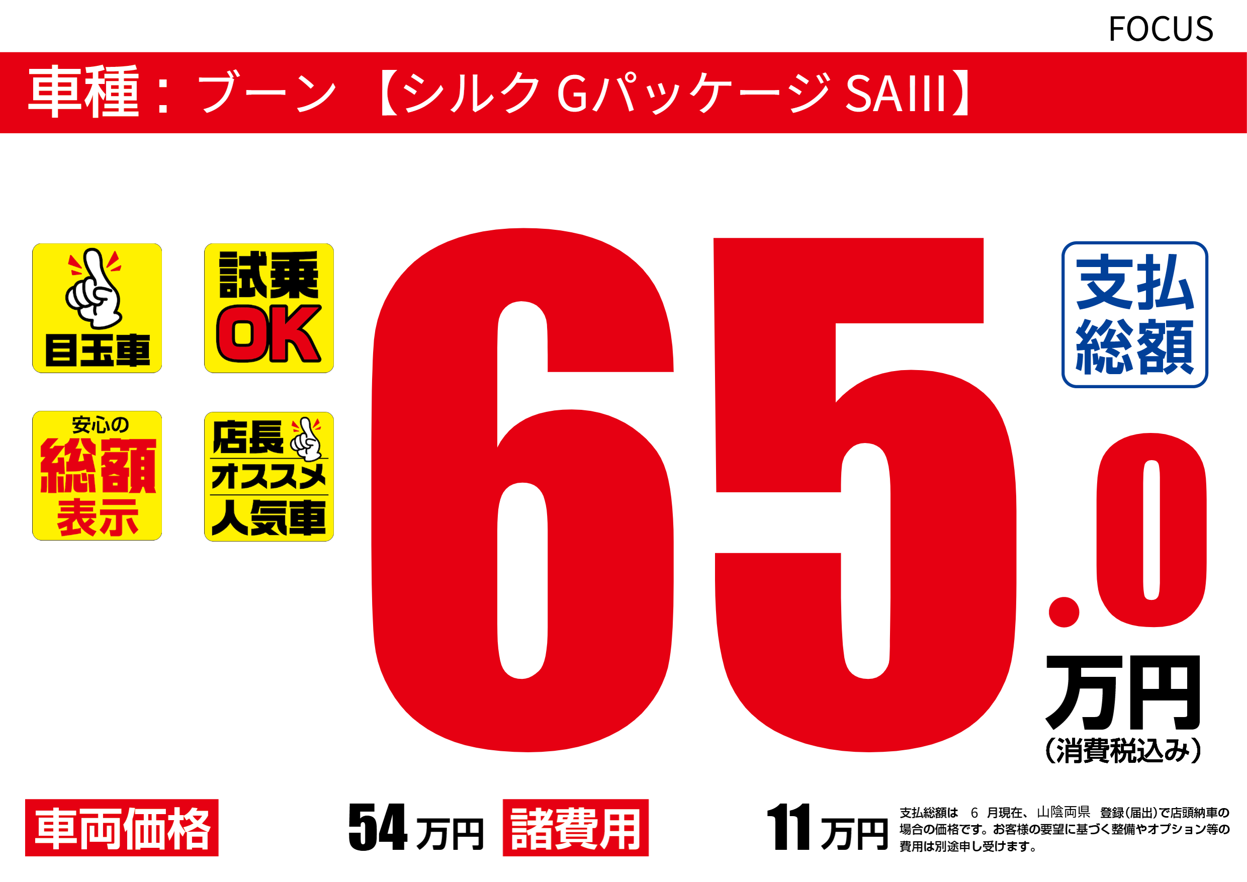 | 車名 | ブーン 【シルク Gパッケージ SAⅢ】 | グレード ミッション 排気量 |