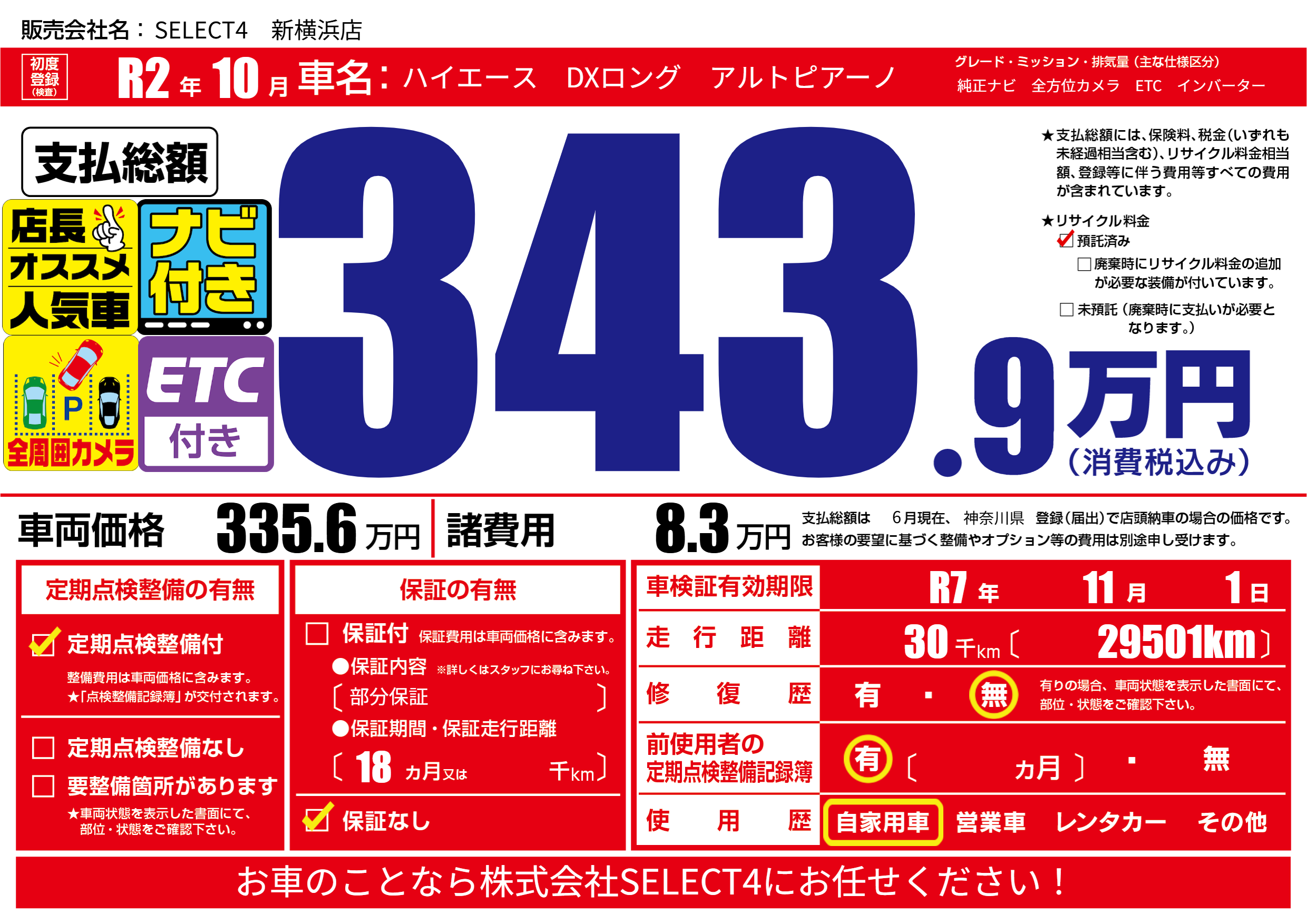 | 車名 | ハイエース DXロング アルトピアーノ | グレード ミッション 排気量 |