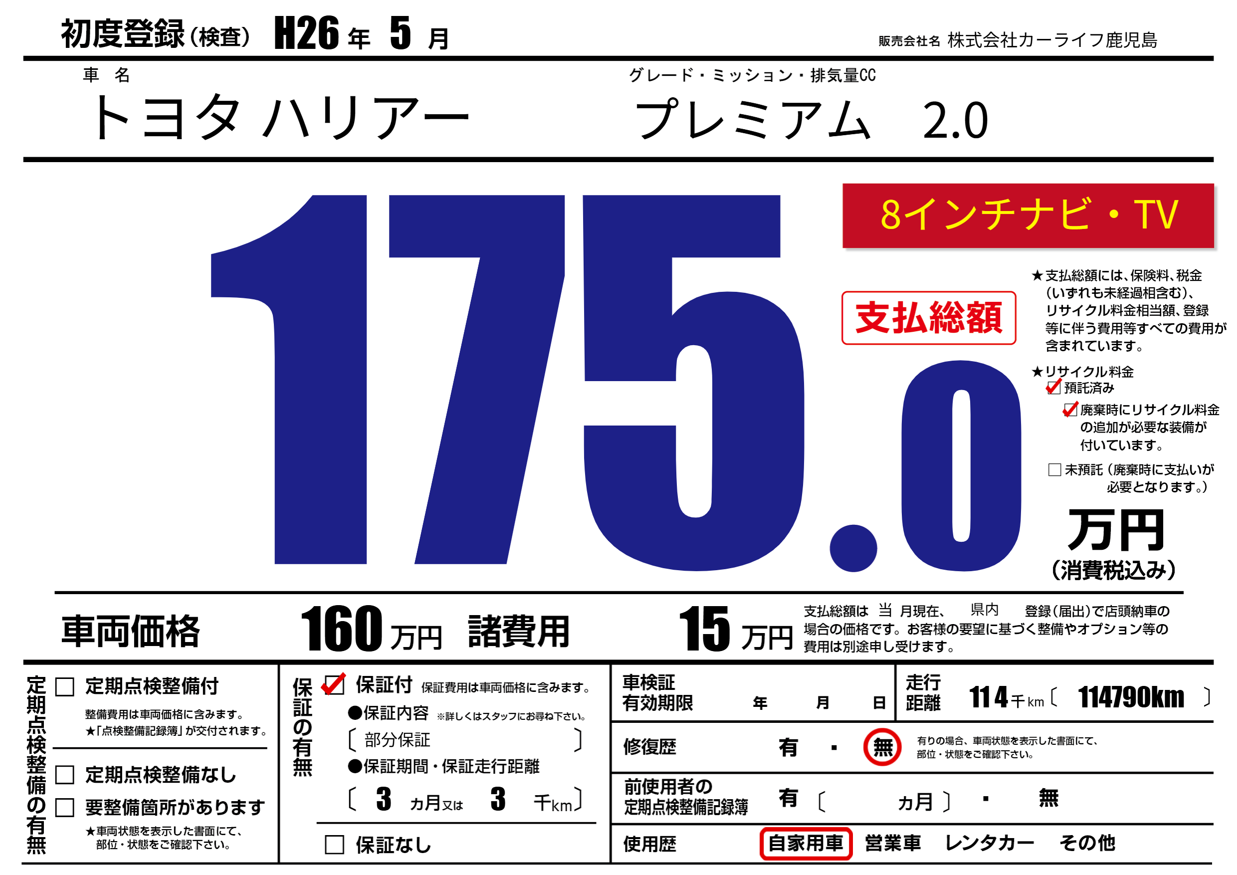 | 車検制限 | - 年 - 月 - 日 | ||