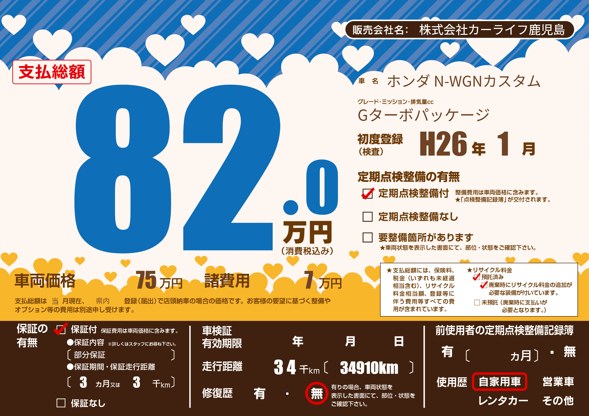 | 車名 | ホンダ N-WGNカスタム | グレード ミッション 排気量 |