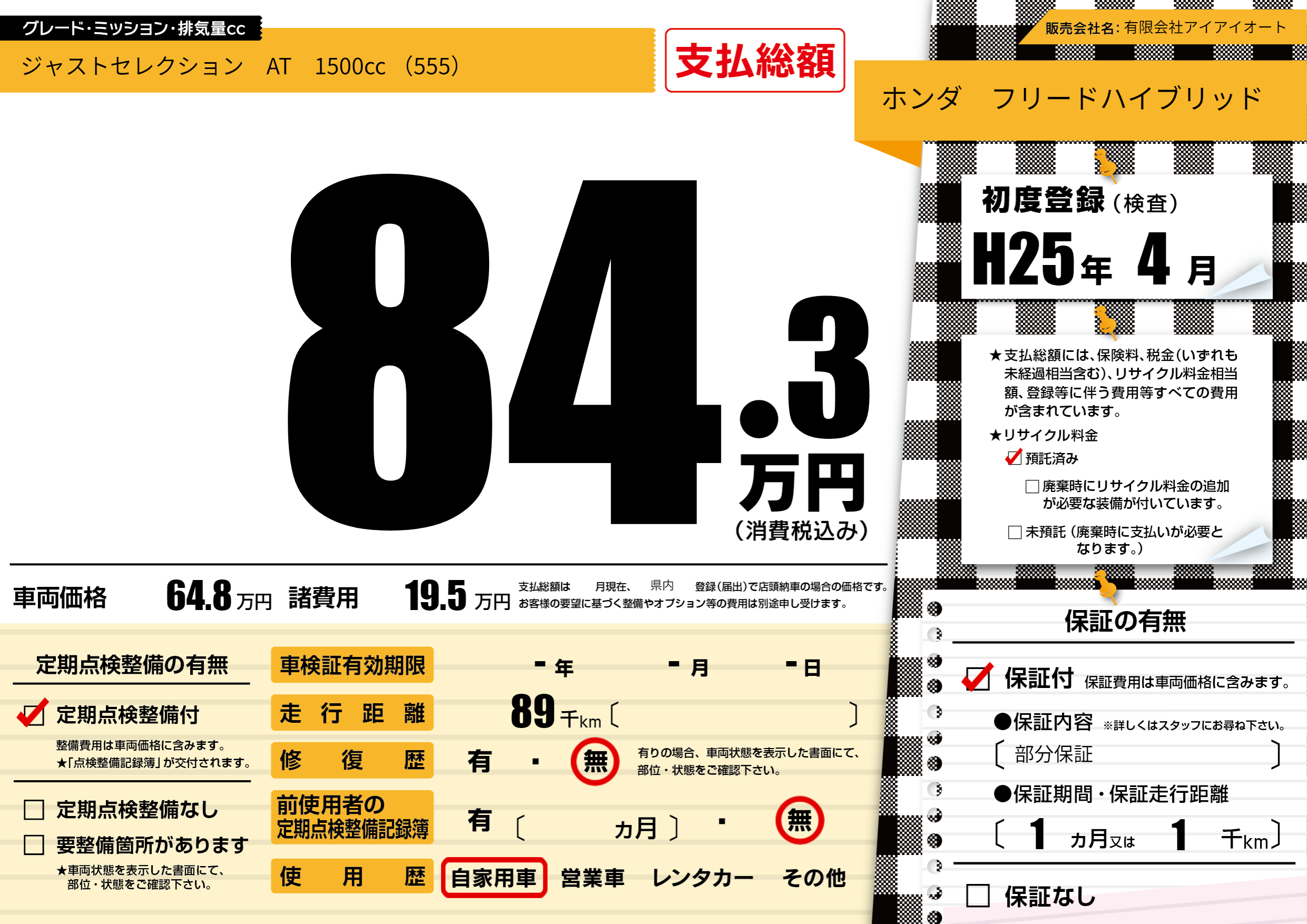 | 車名 | ホンダ フリードハイブリッド | グレード ミッション 排気量 |