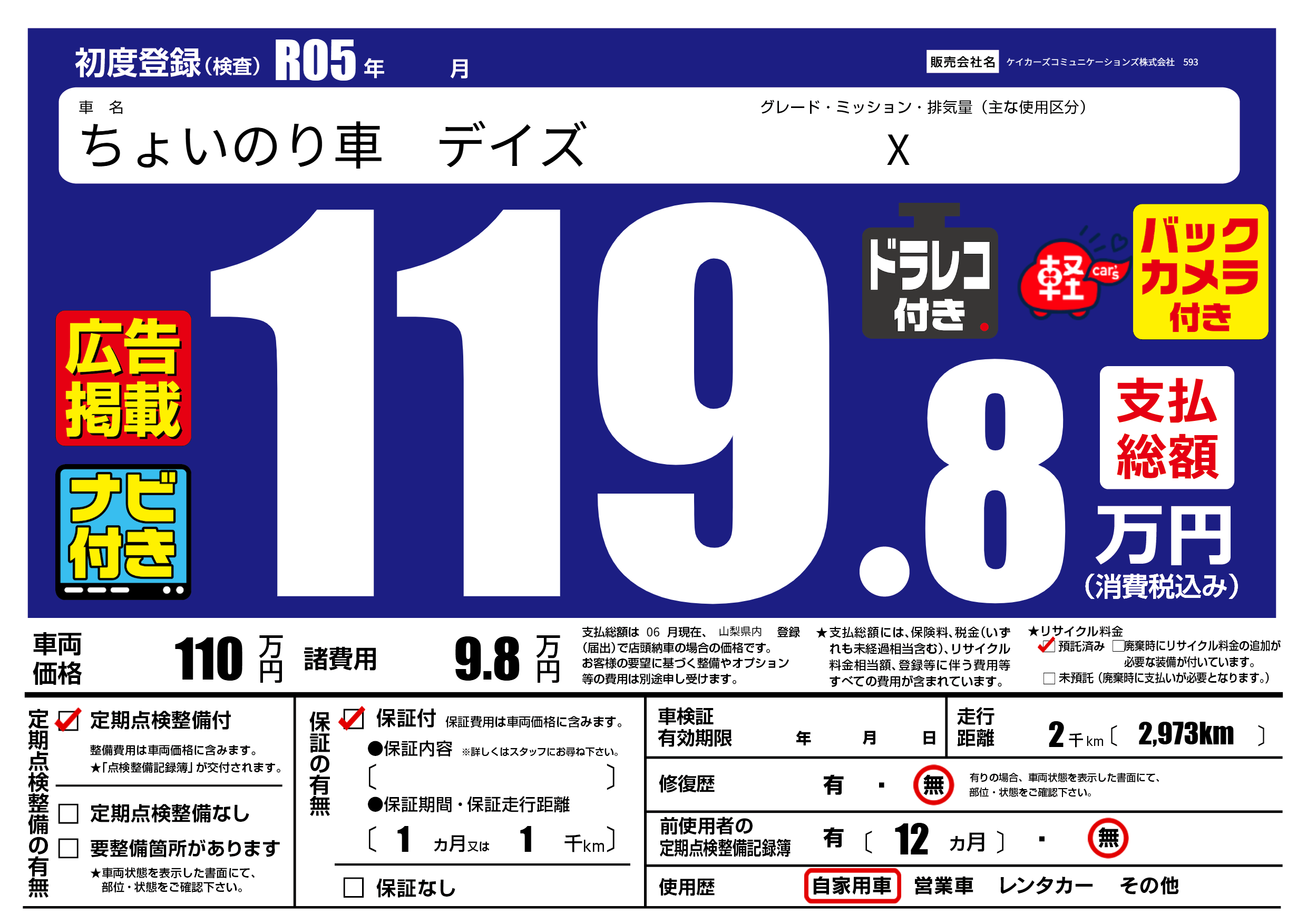 | 車名 | ちょいのり車 デイズ | グレード ミッション 排気量 |