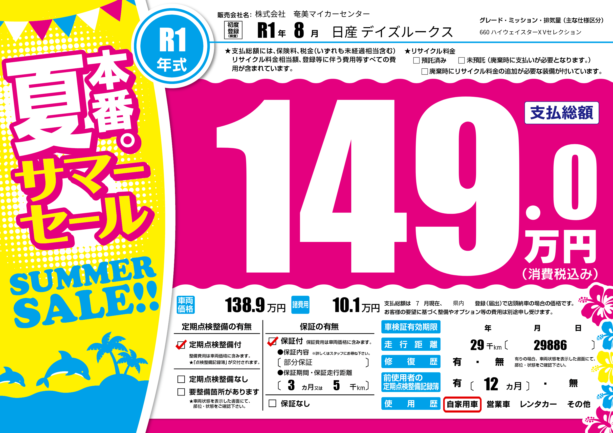 | 走行キロ | 2.9万km | 初年度登録 | R1年8月 |